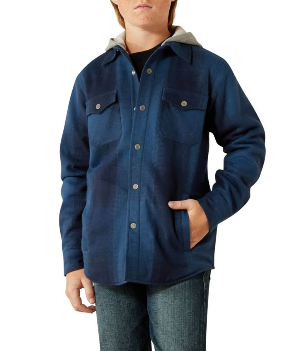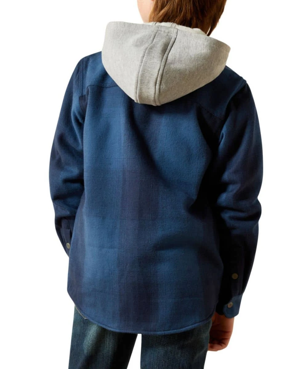 100% Cotton; Hooded Shirt Jacket; Long Sleeves; Spread Collar; Snap Front Closure; Snap Cuffs; Single Point Snap Flap Chest Pockets; Open Hand Pockets; Straight Back Yoke; Plaid Print; Color: Blue Nights; Style #10062466