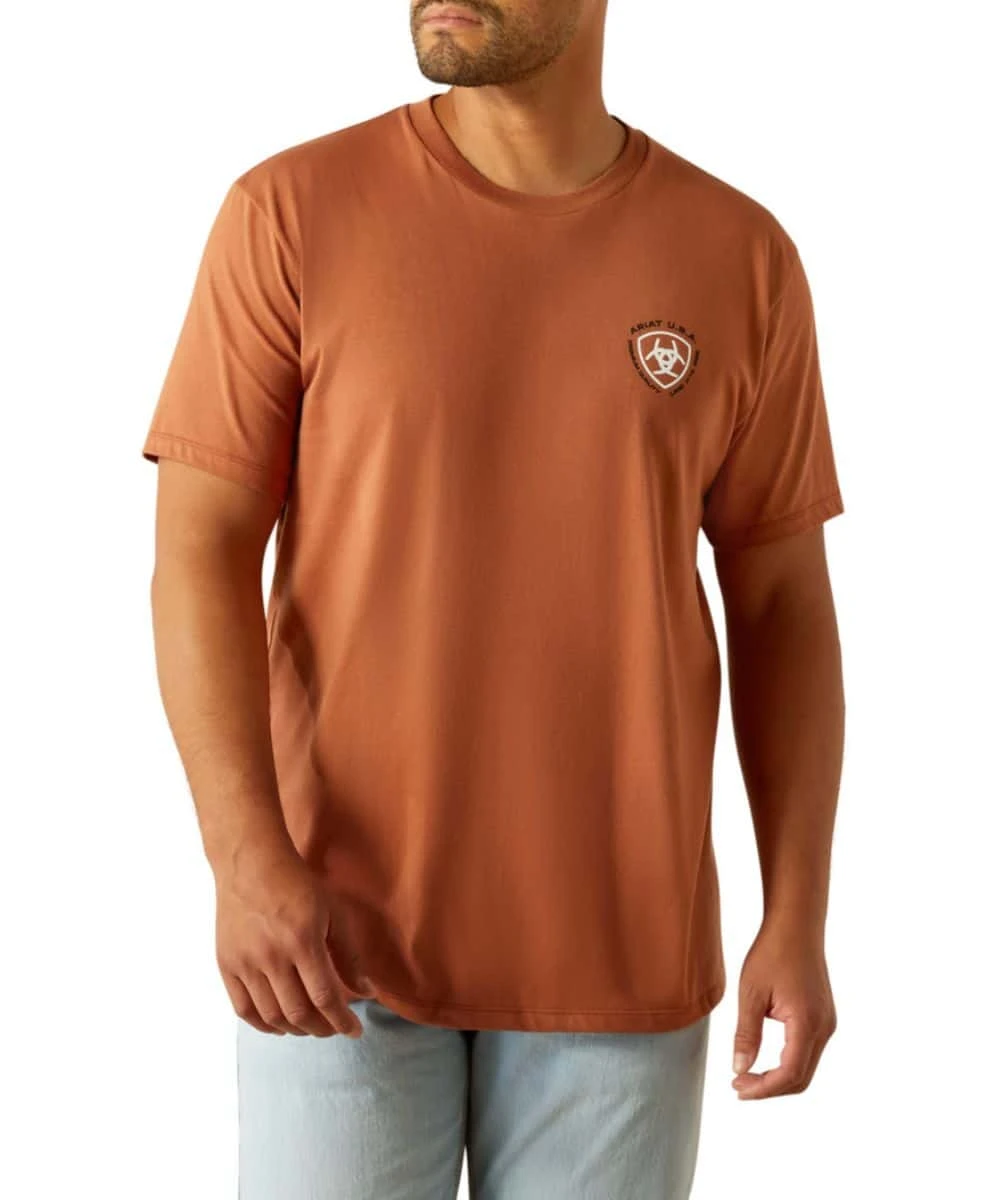 100% Cotton; Short Sleeves; Crewneck; Small Ariat Shield Logo On Chest; Large Screen Printed Ariat Shield Logo On Back; Color: Chutney/Orange; Style #10058887