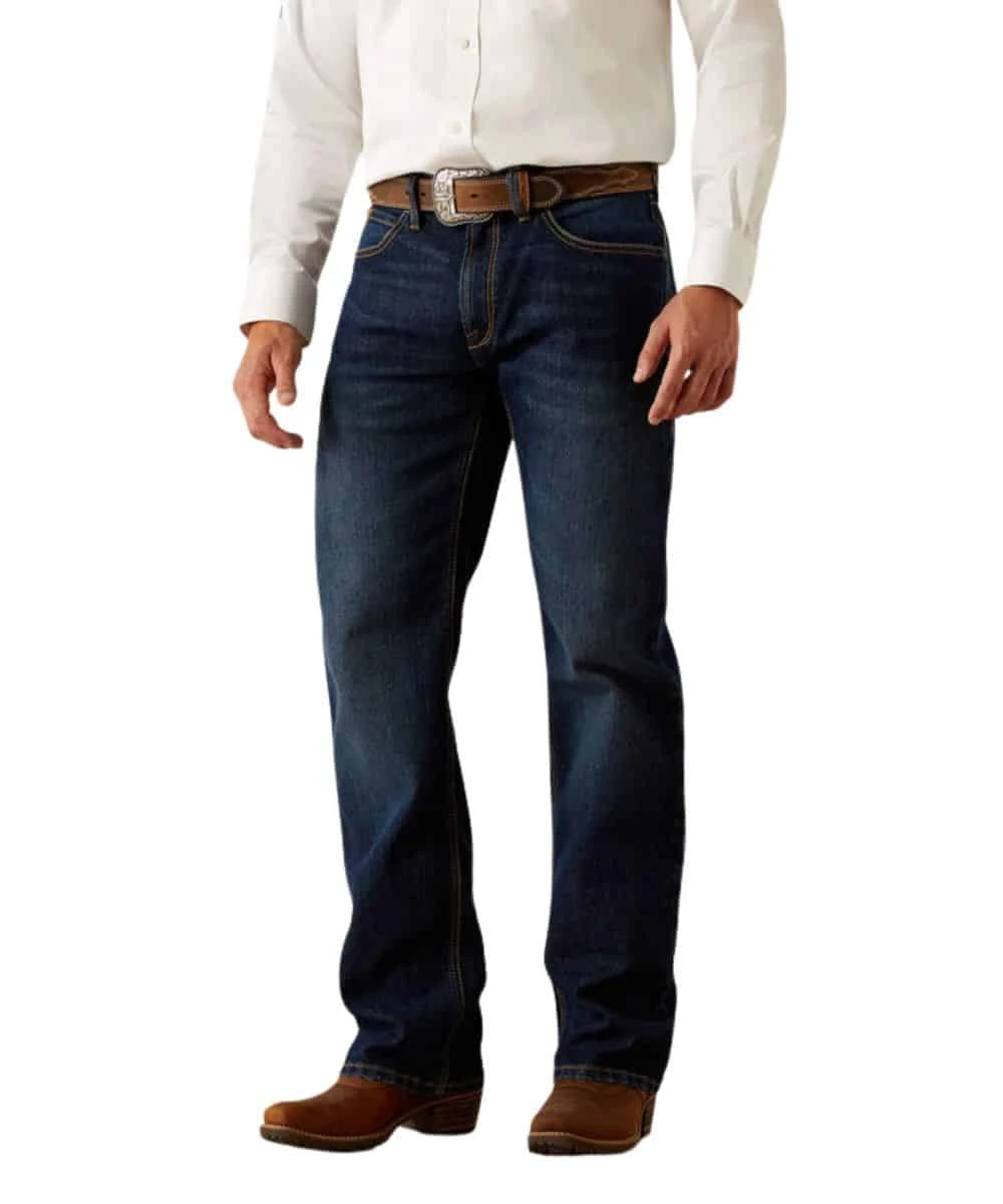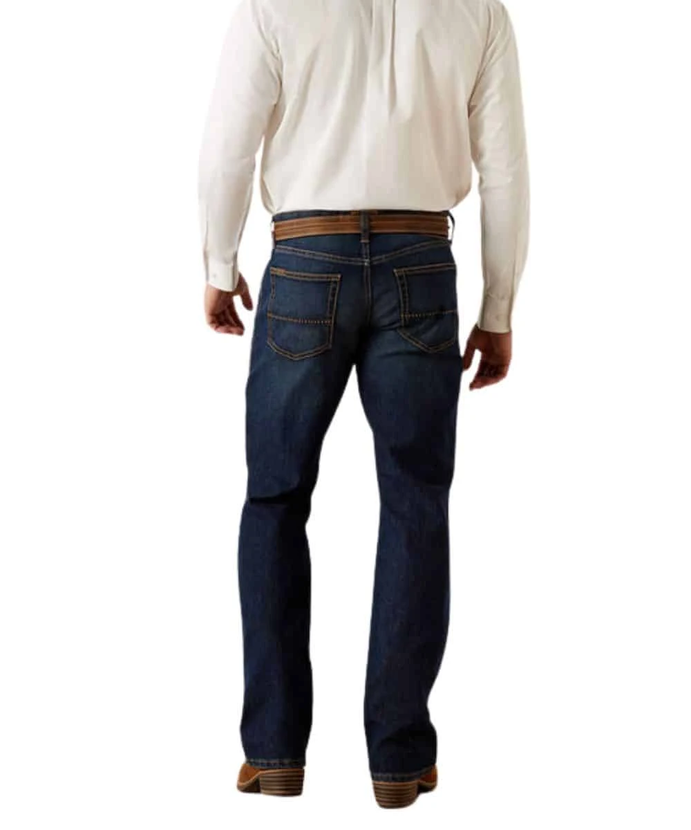 67% Cotton/32% Polyester/1% Elastane; 13.5 oz Ring-Spun Stretch Denim; Relaxed Fit; Mid Rise; Zip Fly With Button Closure; Heavy-Duty Zipper And Hardware; Five Pocket Styling; Extra Deep Front Pockets; Whisker And Hand Sanding Details; Contrast Stitched Back Pockets; Loop Lock Reinforces The Back Belt Loop For Extra Durability; Relaxed Through The Waist, Hip, And Thigh; No-Rub Comfort Inseam With Flat Construction; Boot Cut Leg; 19″ Leg Opening Stacks Perfectly Over Boots; Dark Wash; Color: Sullivan; Style #10058937