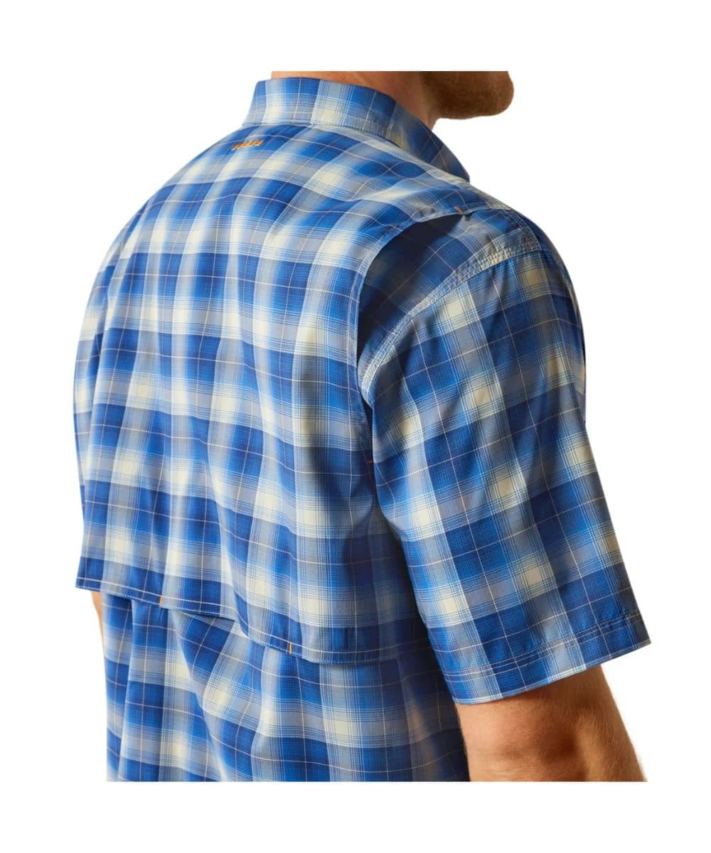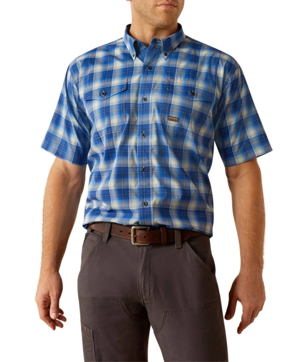 92% Polyester/8% Spandex; 4 oz Technical DuraStretch Fabric Provides Durability With The Freedom To Move; Short Sleeves; Button Down Collar And Placket; Single Point Button-Through Flap Chest Pockets With Logo Label And Hidden Pen/Pencil Slot; Mesh Lining; Rebar Logo Embroidery At Back Collar; VentTEK Technology Puts Airflow Where You Need It Most To Keep You Cool; Greater Arm Mobility Lets You Move Freely; Moisture Movement Technology Helps Keep You Dry; UPF 50 Sun Protection Fabric; Three Rows Of Stitching Adds Durability; Microfiber Lens Cloth Is Hidden In The Hem For On-The-Go Cleaning; Long Back Hem Helps Keep You Covered While You Bend And Stretch; Contains Materials That Meet The Bluesign Sustainability Standards; Generous Fit That Gives You Room To Bend, Reach, And Lift With A Longer Hem That Stays Tucked-In; Strong Blue Plaid Print; Color: Blue; Style #10058537