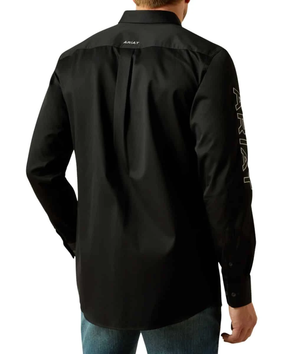 100% Cotton; Solid Twill; Fitted/Slim Fit Through The Chest, Waist, And Sleeves; Long Sleeves; Button Down Collar, Placket, And Cuffs; Single Open Chest Pocket With Grey Ariat Logo Shield Embroidery; Straight Back Yoke With Box Pleat; Grey Ariat Logo Embroidery Down Sleeve And At Collar; Greater Arm Mobility Lets You Move Freely; Color: Black; Style #10062659