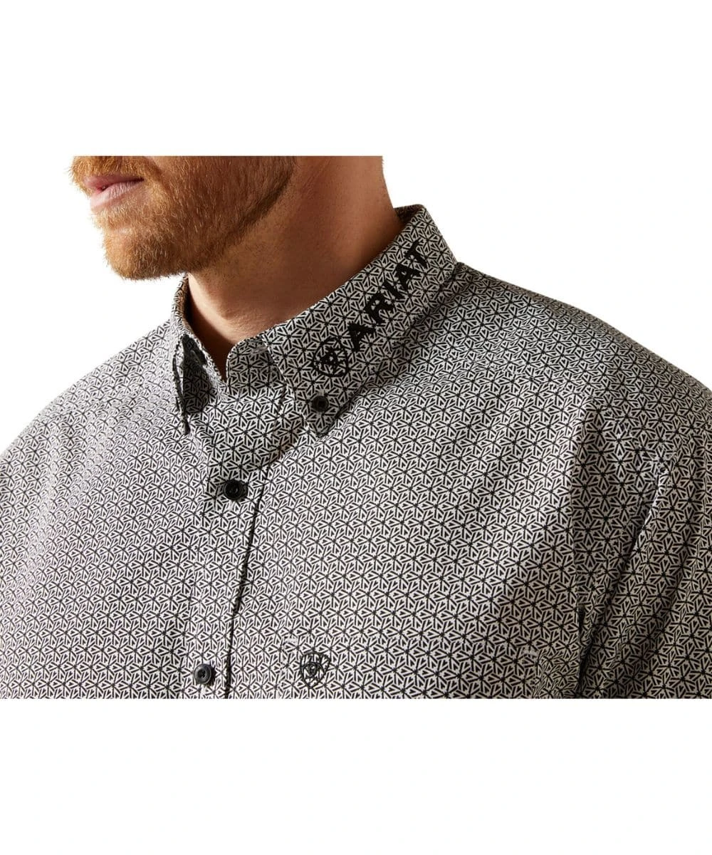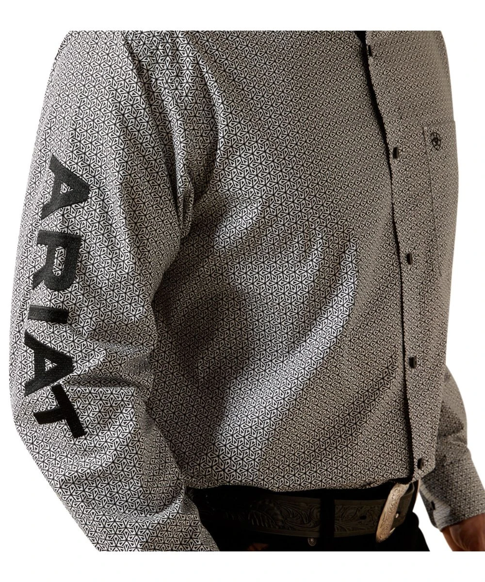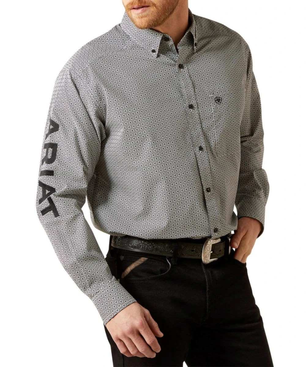 100% Cotton; Classic Fit; Long Sleeves; Button Down Collar, Placket, And Cuffs; Adjustable Cuffs With Extended Button Detail Make It Easier To Roll Up Your Sleeves; Single Open Chest Pocket With Logo Embroidery And Hidden Pen Slot; Bold Ariat Team Embroidery On Sleeve, Collar, And Back; Straight Back Yoke With Box Pleat; Geometric Print; Color: White/Black; Style #10065815