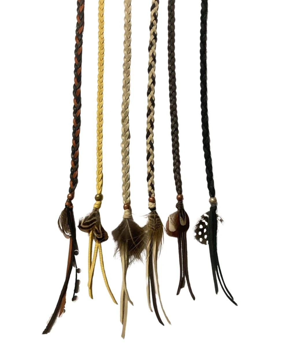 Deerskin Leather; Pheasant Feather; Can Be Worn As A Bracelet, Hatband, Or Necklace; 37″ Between Beads; 6 Color Ways Available: Black And Gray, Chocolate Brown, Yellow, Ivory, Ivory With Brown, And Brown With Black And Natural; Please Note Your Order With Your Color Preference; Style #BK-B1090