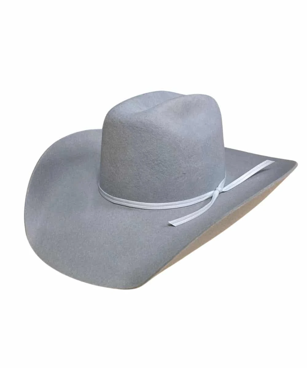 2X 100% Premium Wool; 4 3/4″ Low Crown; 4″ Hereford Brim; Ribbon Band; Color: Silver; Style #2X SILVER LOW CROWN