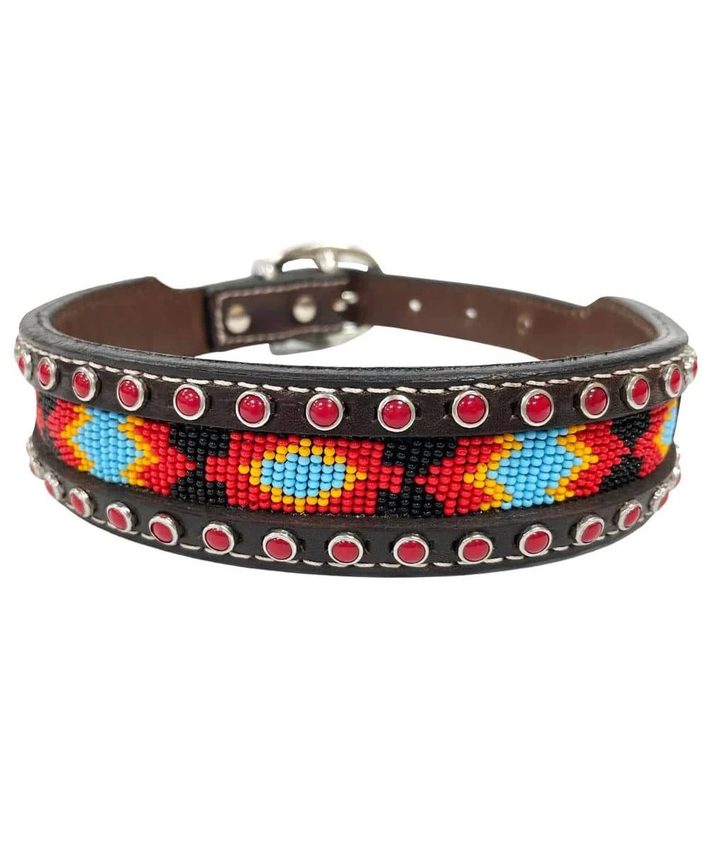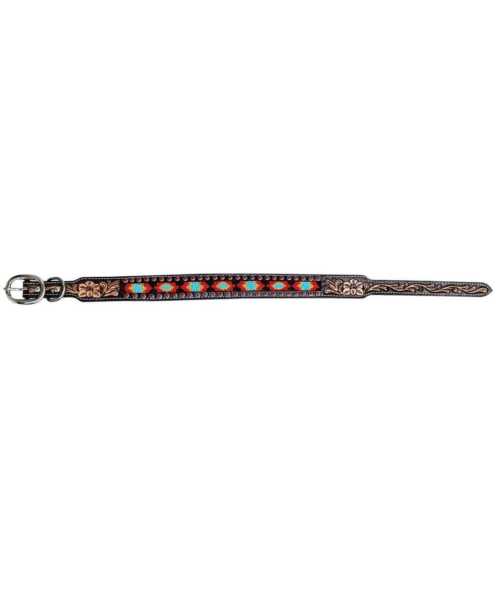 Premium Quality American Cowhide Leather; Southwestern Beaded Center With Red Studded Border; Floral Hand Carved Ends; Silver Hardware; Adjustable Sizes Measures Approximately: Small (9″ – 13″), Medium (13″ – 17″), Large (17″ – 21″), Extra Large (21″ -25″); Color: Dark Brown; Style #BER224-DC