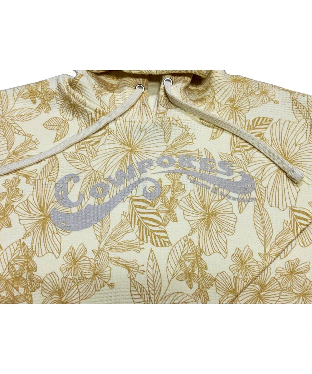 55% Cotton/45% Polyester Waffle Knit Blend; Classic Fit; Long Sleeves; Hooded Collar With Drawstring; Grey Screenprint On Front Reads: “Cowpokes Work & Western”; Side Vents On Waistband At Seams; Ribbed Cuffs And Waistband; Maddie Floral Print; Color: Yellow/Sun Ray; Style #COWPFLORALHOOD
