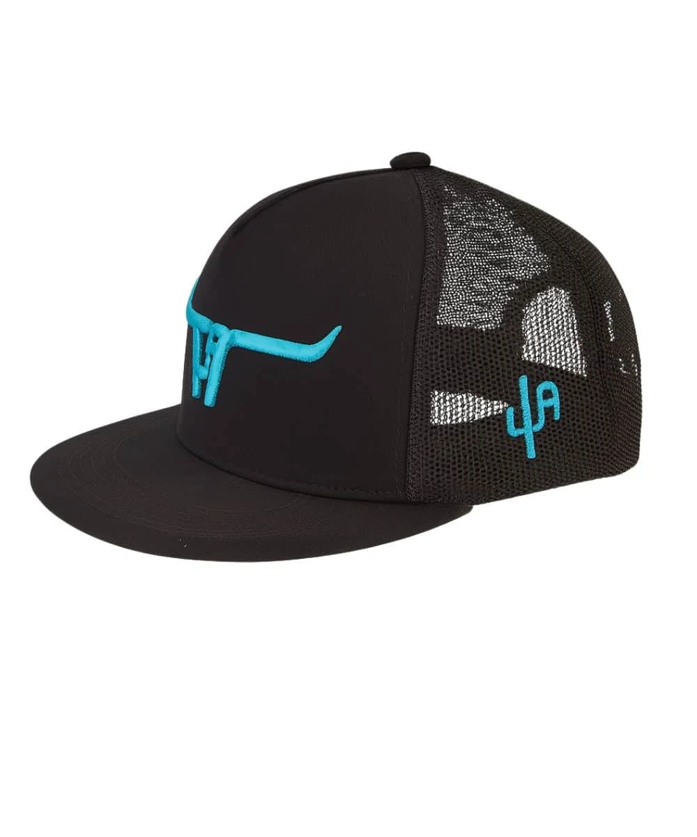 5 Panel Construction; Black Front And Bill; Turquoise Longhorn Logo Puff Embroidery On Front; Black Mesh Sides And Back; Snapback Closure; One Size Fits Most; Style #6006BLK-S127