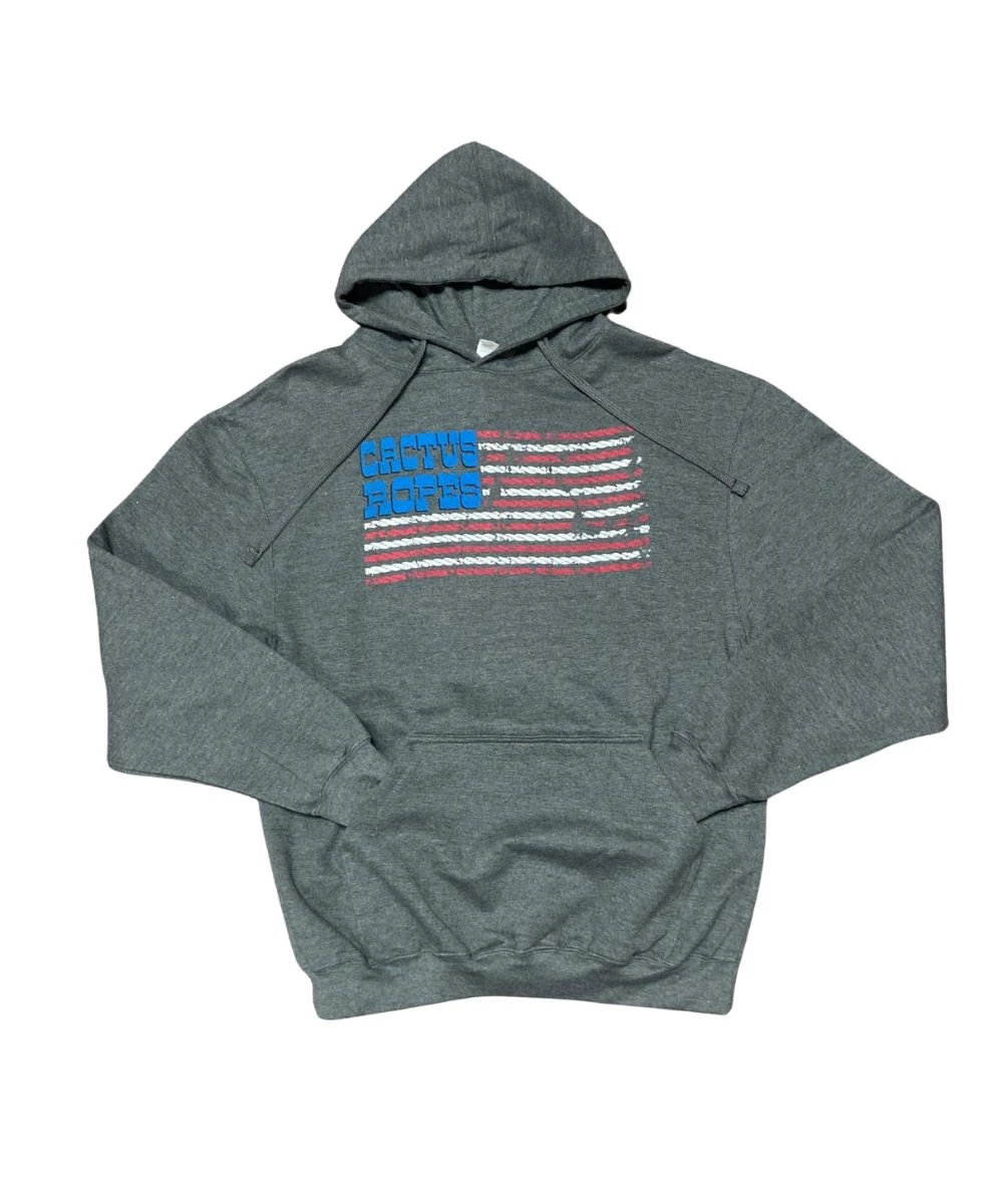 50% Cotton/50% Polyester; Long Sleeves; Hooded Collar With Drawstring; American Flag Screen Print On Front With Logo; Kangaroo Pocket; Ribbed Cuffs And Hem; Color: Heather Grey; Style #SWEATHDFLAG