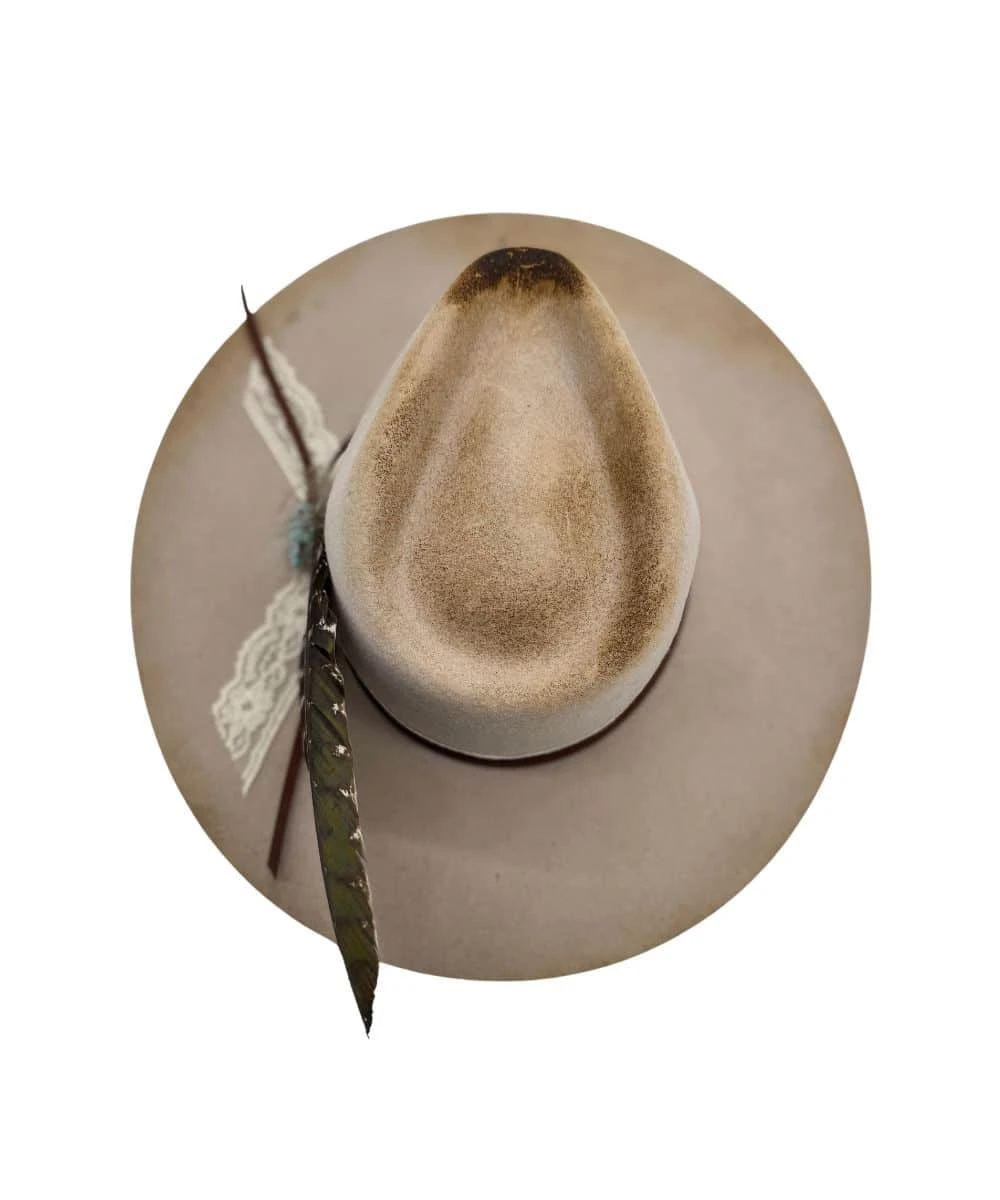 100% Wool Felt; Distressed Detailing; 3 1/2″ Flat Brim; Pinched Front Crown; Lace Ribbon And Leather Strip Hat Band Featuring A Turquoise Color Stone Concho And Feather; Charlie Logo Brand On Front; Color: Silver Belly; Style #CWSMSH-4034