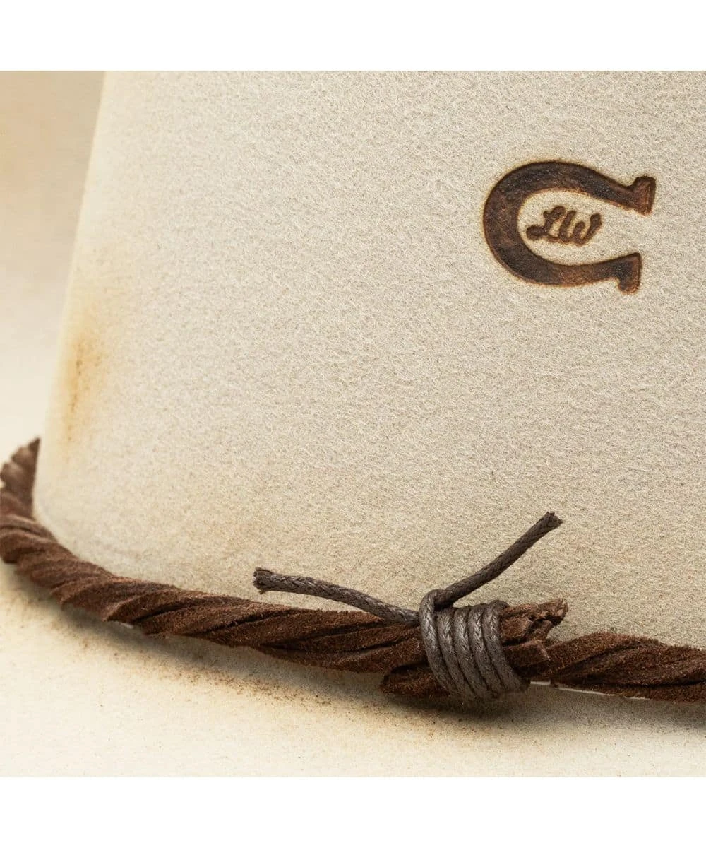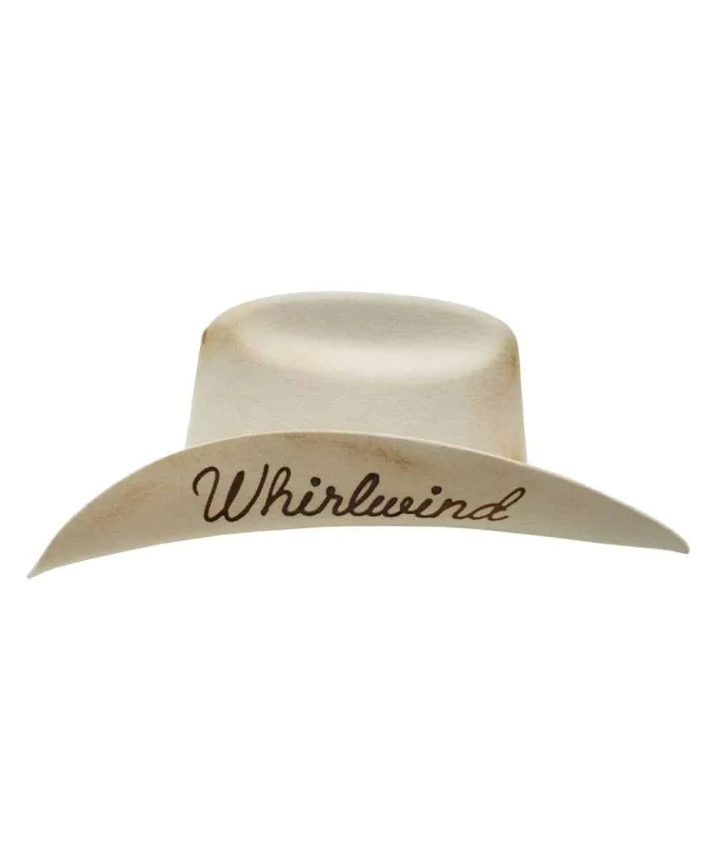 Lainey Wilson Collection; Firm Wool Hat; 4″ Brim; 4 1/2″ Cattleman Crown; Brown Twisted Hatband; Distressed Detailing; “Whirlwind” Engraved Into The Brim; Cloth Sweatband; Color: Ranch Tan; Style #CWWHWD-7240