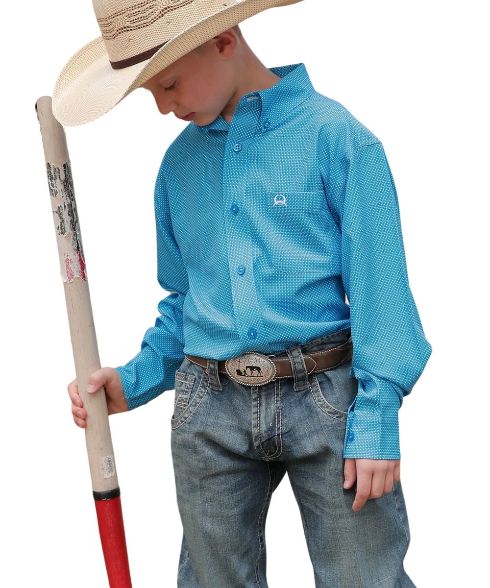 Printed Polyester/Spandex; Lightweight; Long Sleeve; Button Down Collar, Placket, And Cuffs; Blue Buttons; Single Open Chest Pocket With Logo Embroidery; Color: Blue With Geo Print; Style #MTW7060315