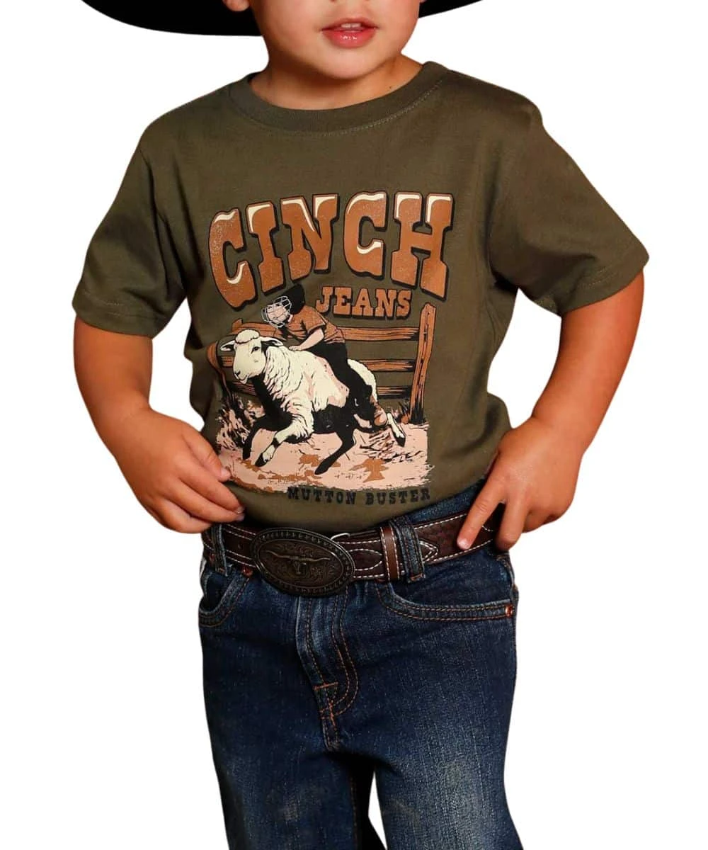 100% Cotton; Short Sleeves; Crew Neck; Front Screen Print Reads: “Cinch Jeans Mutton Buster” With Graphic; Color: Olive; Style #MTT7672064