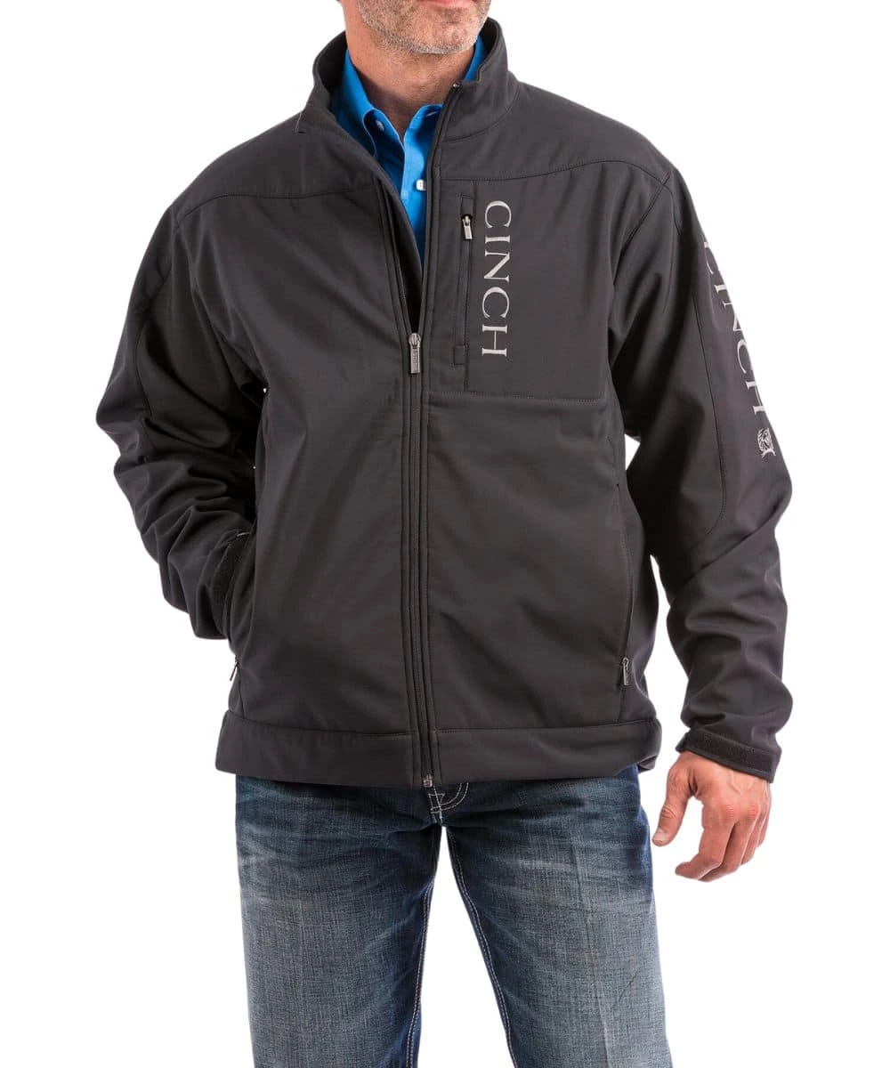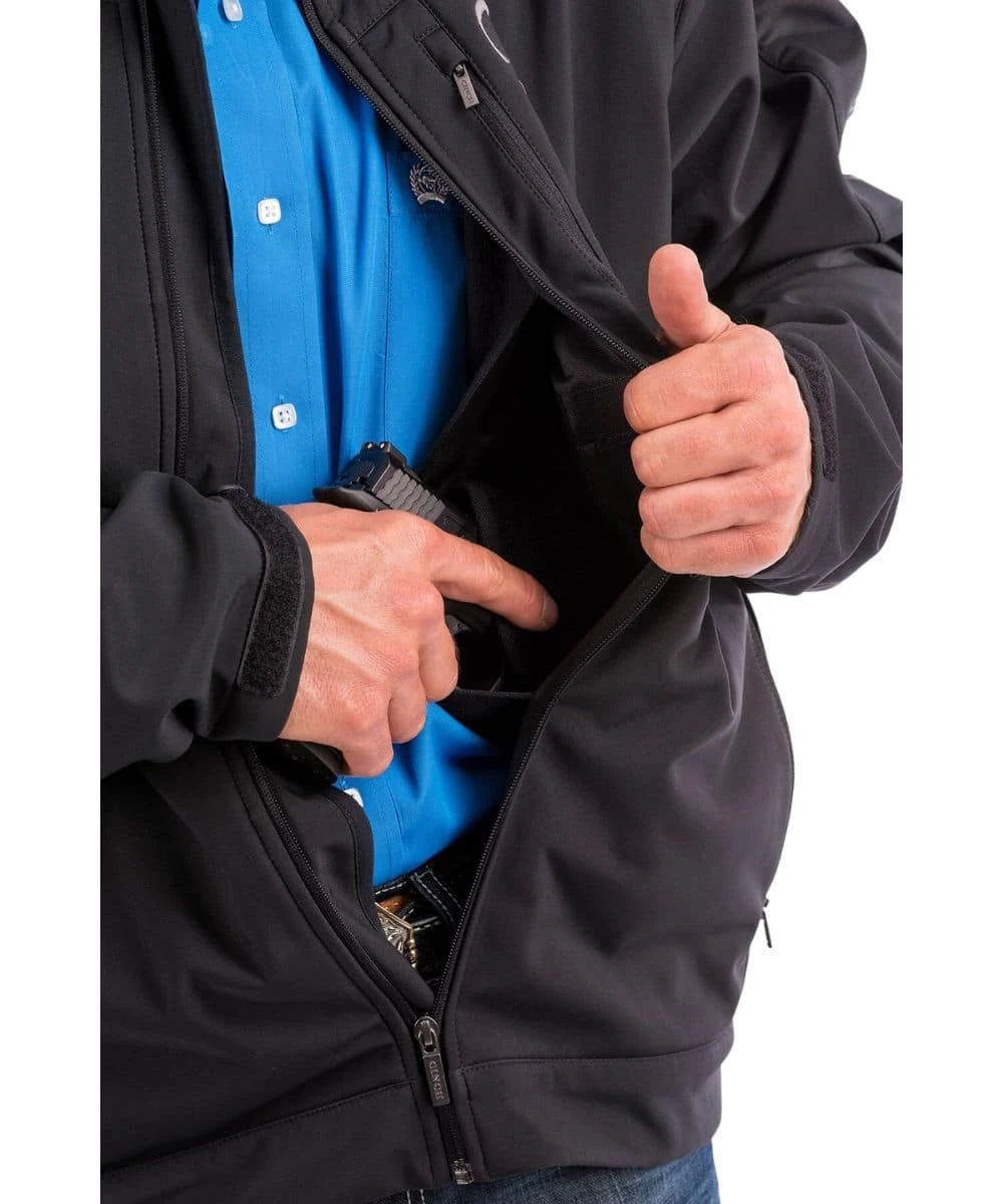Bonded Softshell Jacket; Long Sleeves; Mandarin Collar; Full Zip Closure; Zipper Chest Pocket With Logo Embroidery; Zipper Hand Pockets; Logo Embroidery On Sleeve And Back; Adjustable Cuffs; Dual Interior Concealed Carry Pockets; 1 Velcro Backed Holster; Fleece Backed Fabric; Water And Wind Resistant; Color: Black; Style #MWJ1043014