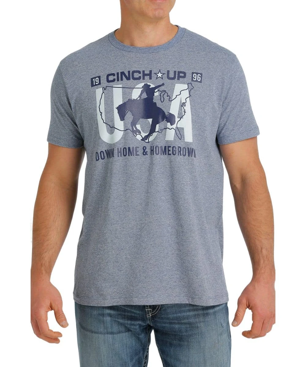 Tri-Color Cotton/Polyester Blend; Short Sleeves; Crew Neck; Screen Printed Patriotic USA Front Graphic Reads: “Cinch Up 1996 Down Home & Homegrown”; Color: Denim Blue; Style #MTT1690500