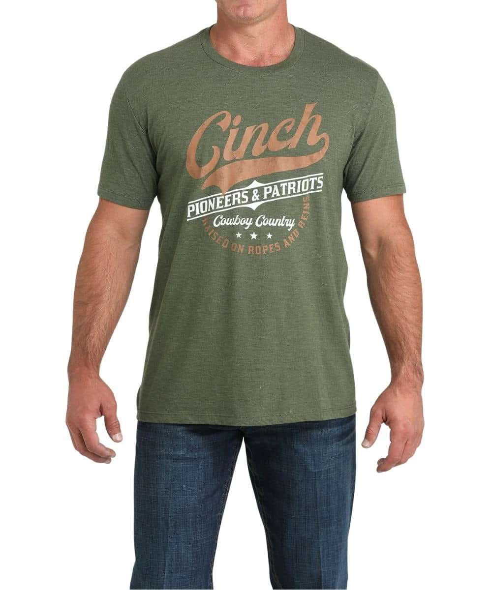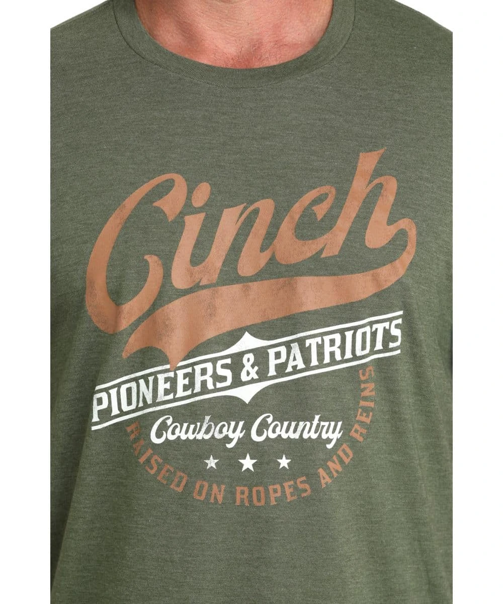 Cotton/Polyester Blend; Short Sleeves; Crew Neck; Front Screen Print Reads: “Cinch Pioneers & Patriots Cowboy Country Raised On Ropes And Reins”; Color: Olive; Style #MTT1690695