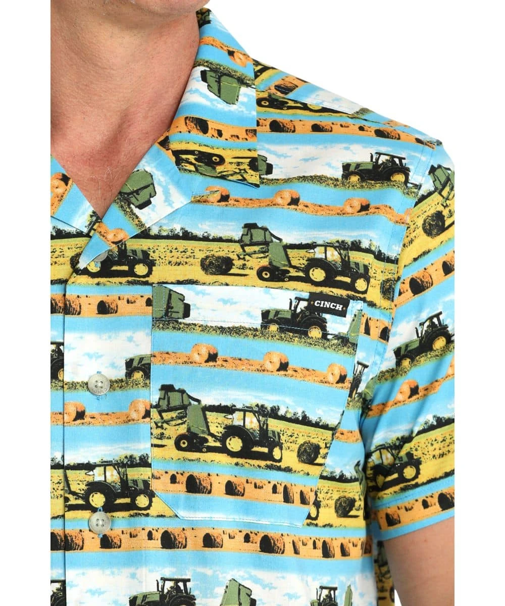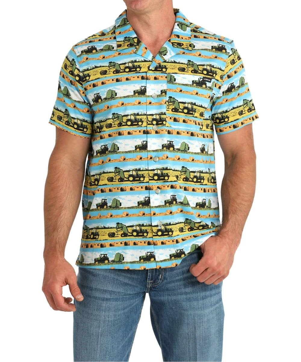 Lightweight Printed Cotton/Modal Plain Weave Camp Shirt; Short Sleeves; Spread Notched Collar; Button Down Placket; Tortoise Logo Buttons; Single Open Chest Pocket With Logo Label; Geometric Hayin’ Season Print; Color: Blue; Style #MTW1401050