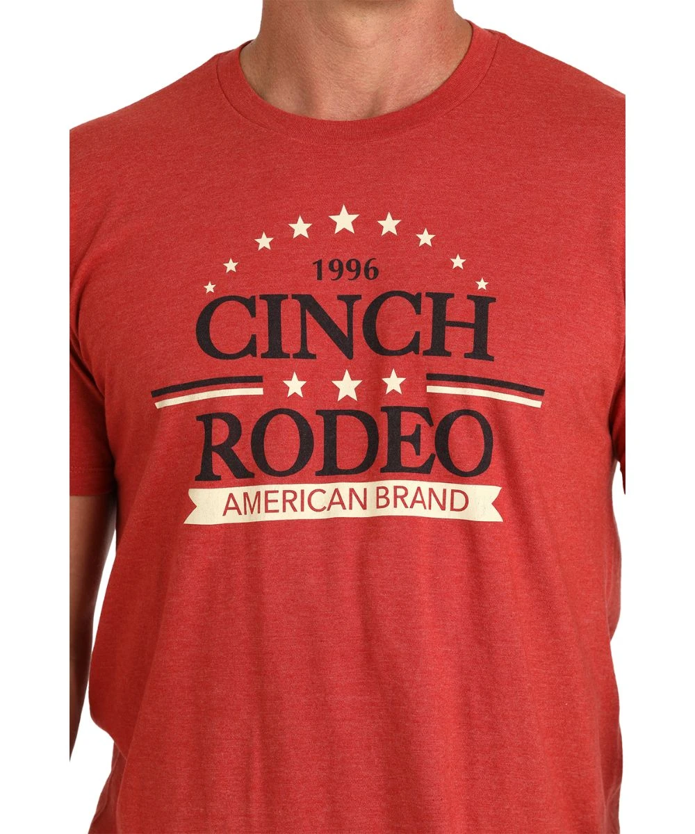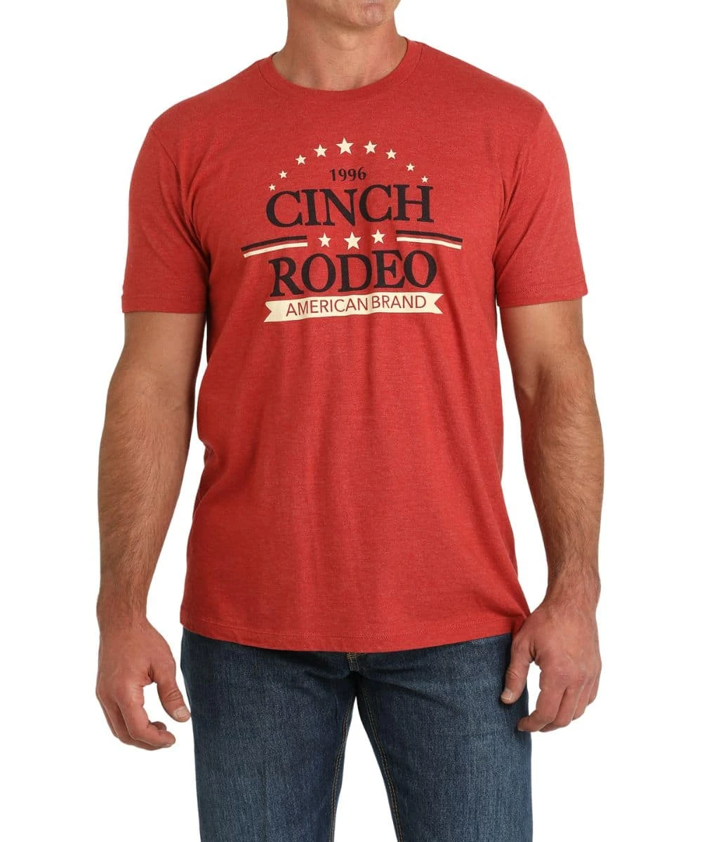 Cotton/Polyester Blend; Short Sleeves; Crew Neck; Large Front Cinch Rodeo American Brand Screen Print; Color: Red; Style #MTT1690636