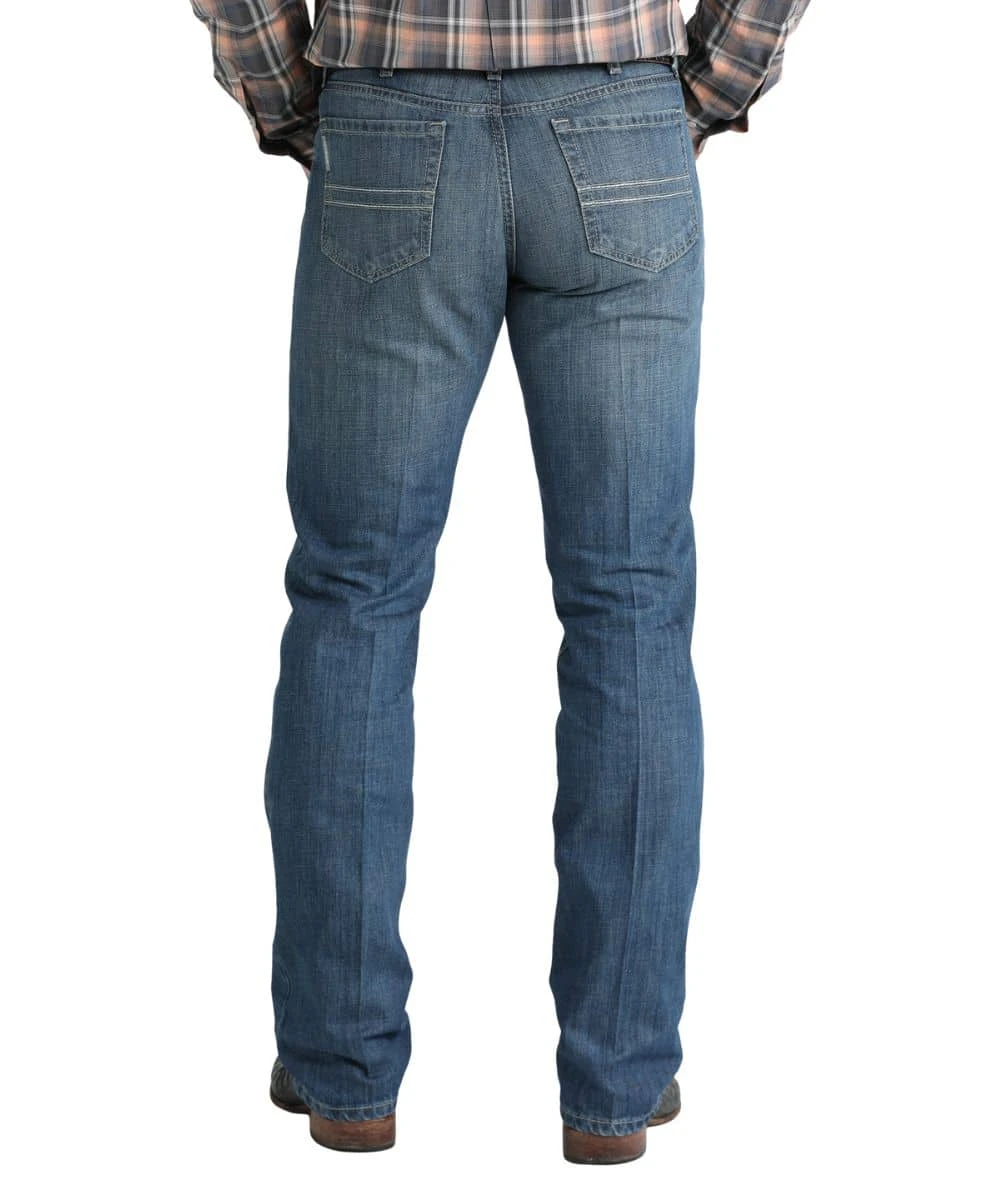 11.7 oz Rigid Denim; Slim Fit; Mid Rise; Zip Fly With Button Closure; Five Pocket Styling; Tint, Hand Sanding, And Whisker Detailing; Silver Label Stitched Back Pockets; Straight Leg; Medium Stonewash; Color: Indigo; Style #MB98034024