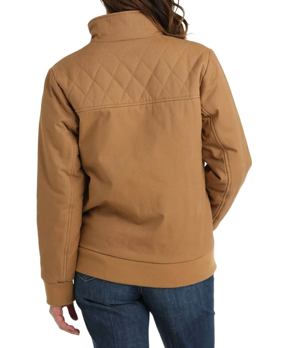 Cotton Twill Canvas Bomber Jacket; Long Sleeves; Mock Collar; Full Zip Closure; Zipper Chest Pocket; Faux Leather Logo Patch; Quilted Yokes; Rib Knit Hem And Cuffs; Snap Flap Hand Pockets; Contrast Lining; Durable Weather Resistant (DWR) Finish; Color: Brown; Style #MAJ9901001