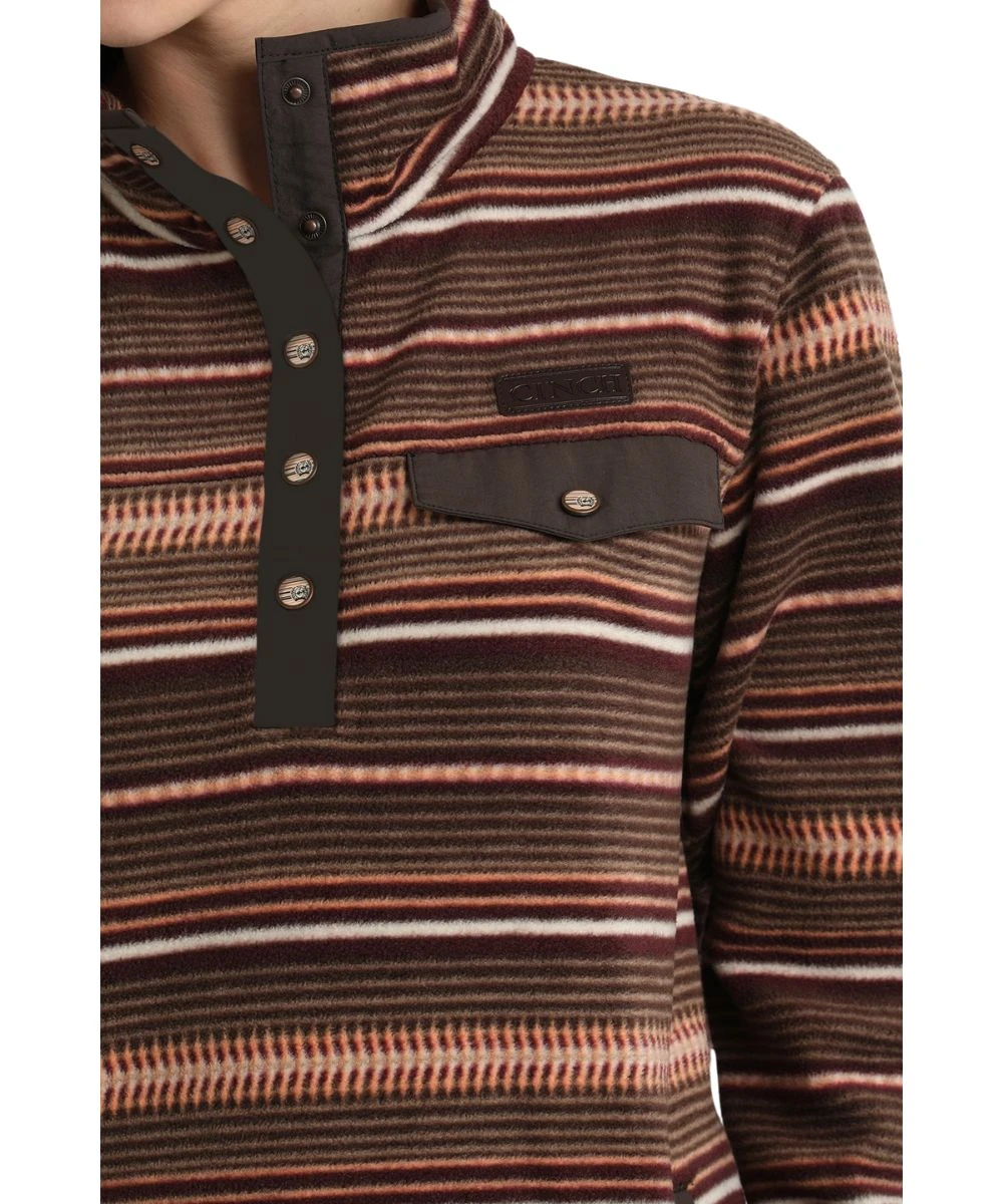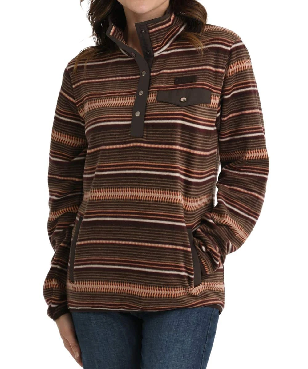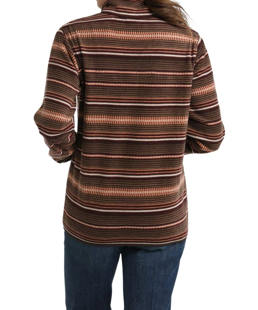 95% Polyester/5% Spandex; Printed Polar Fleece; Long Sleeves; Standing Collar; 5-Snap Placket; Single Point Snap Flap Chest Pocket; Faux Leather Logo Patch; Dual Hand Pockets; Striped Pattern; Color: Brown/Coral; Style #MAK9819009
