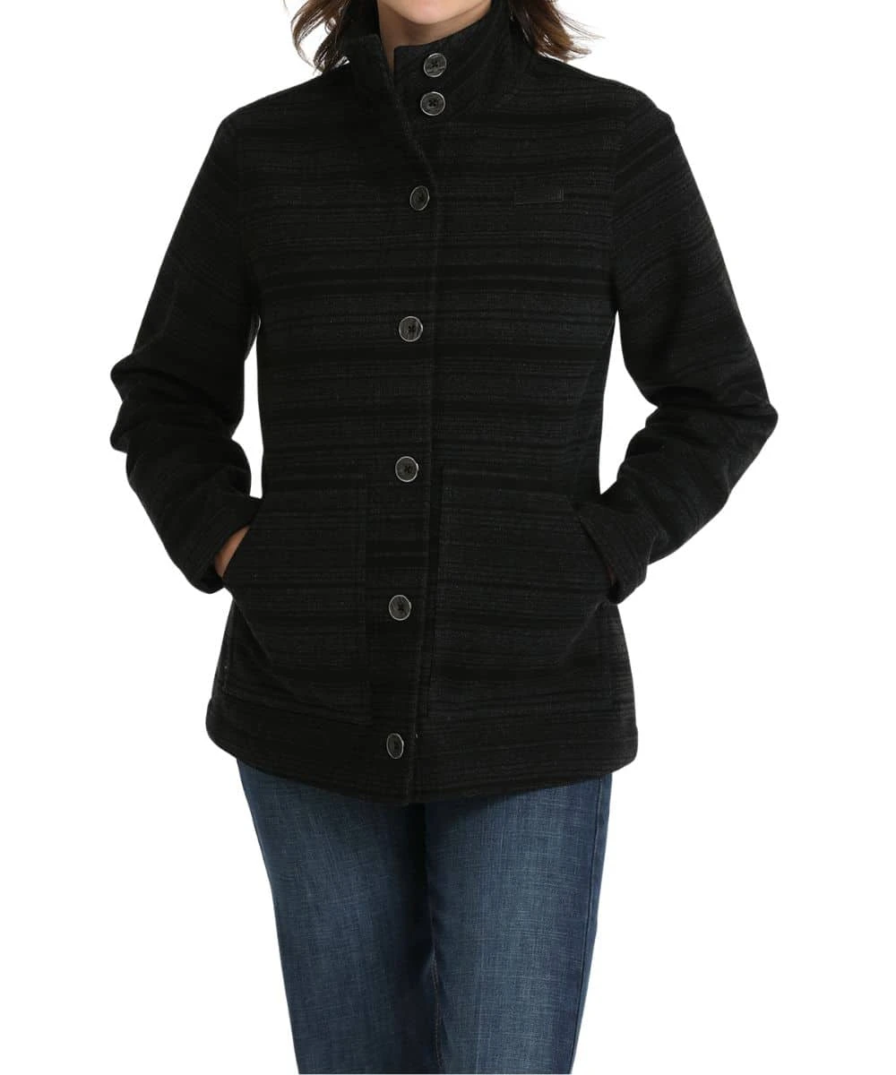 Yarn Dyed Polyester/Wool Twill Jacket; Polyester Lining; Long Sleeves; Standing Collar; Button Front Closure; Tortoise Buttons; Faux Leather Logo Patch On Chest; Hand Pockets; DWR (Durable Water Resistant) Finish; Color: Black; Style #MAJ9892002