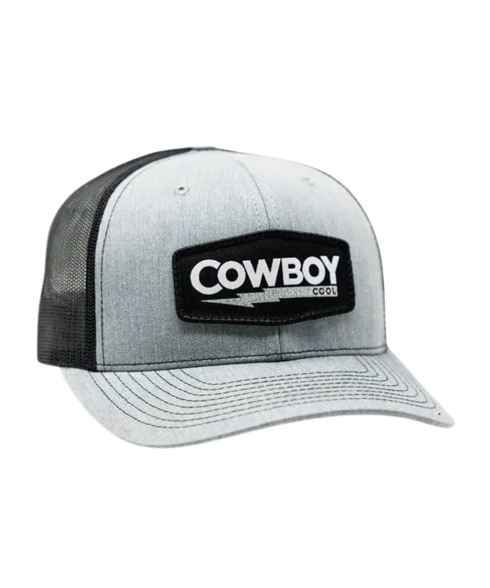 6 Panel Construction; Heather Gray Front Panels; Black Patch On Front Center With Cowboy Cool And Lightning Bolt On It; Black Mesh Back Panels; Snap Back Closure; Style #H531