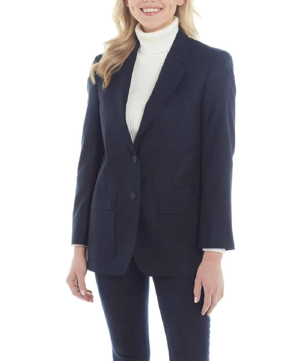 80% Polyester/20% Rayon; Long Sleeves; Spread Collar; Padded Shoulders; 2 Front Buttons; 3 Side Buttons On Cuff; 1 Breast Pocket; 2 Flap Closure Pockets; Color: Navy; Style #CL7287