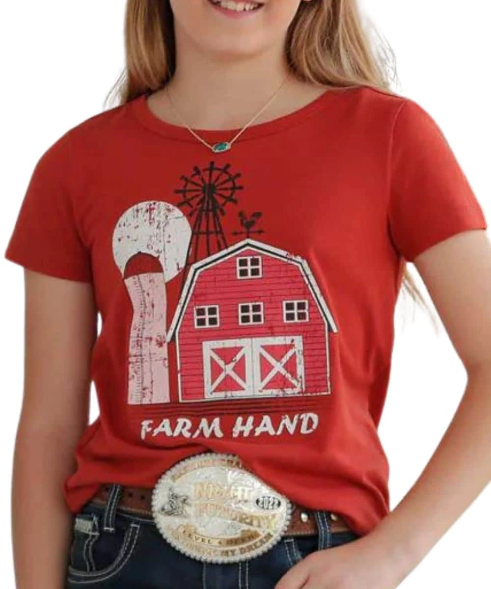 60% Cotton/40% Polyester; Short Sleeves; Crew Neck; Front Screen Print Reads: “Farm Hand” With Farm Graphic; Color: Red/Ketchup; Style #CTK8910001