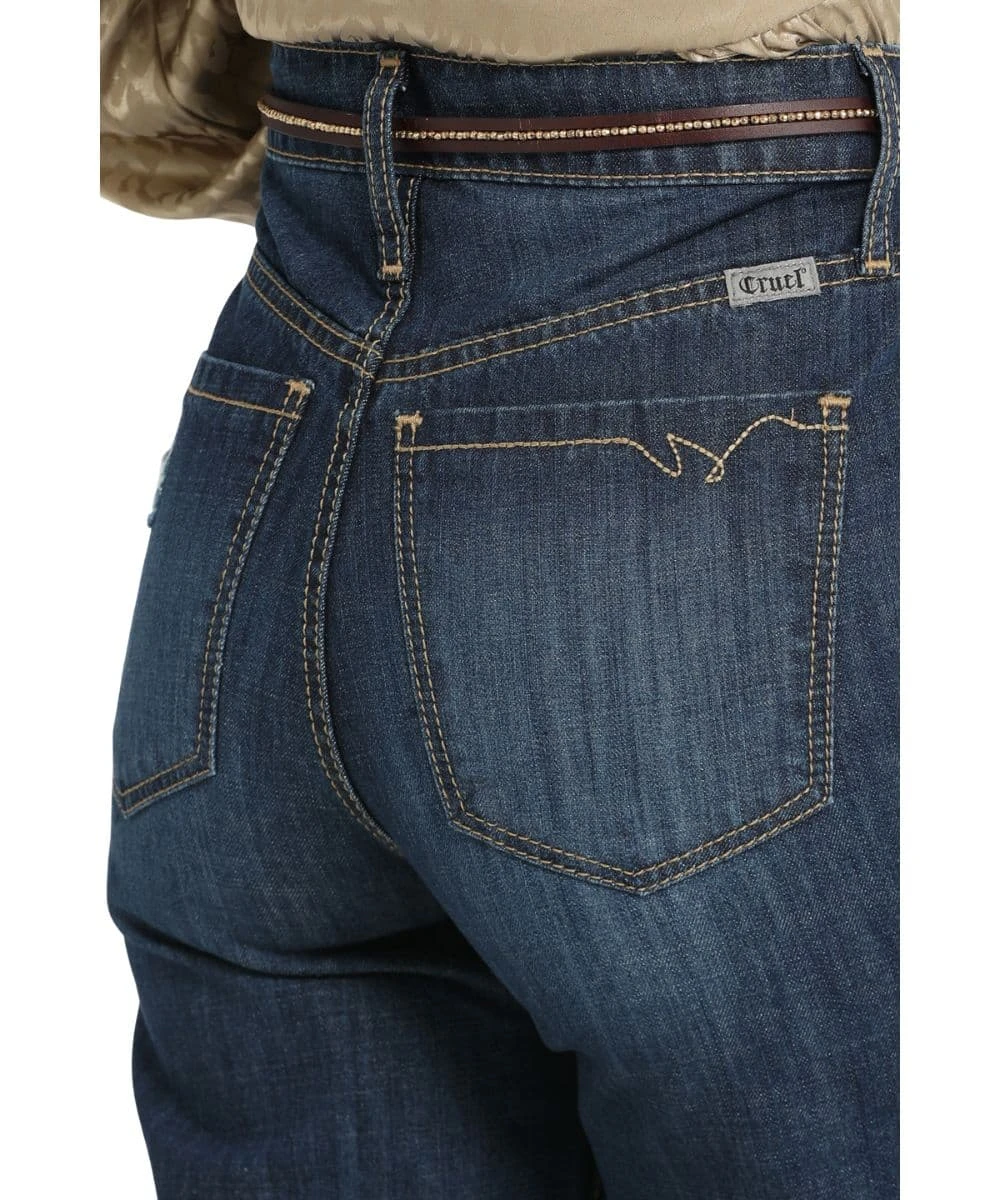 11.7 oz. Rigid Denim; Sky-High Rise; Trendy Button Fly; Four Pocket Styling; Sanding, Whiskers, And Tacking Details; Destructed Knees; Tonal Stitching; Wide Leg; Raw Finished Hem; Color: Dark Stonewash; Style #CB74854001