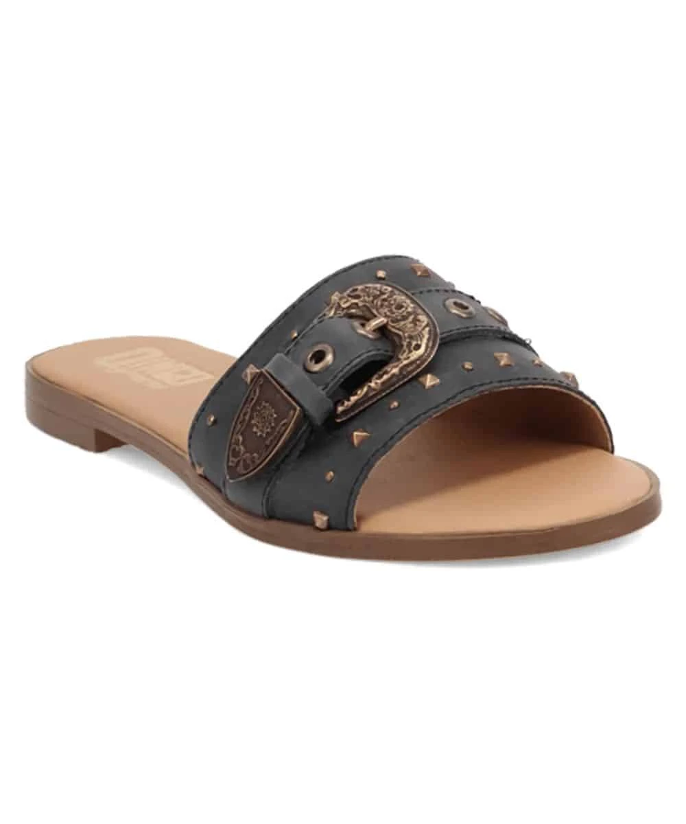 Premium Leather Upper; Open Toe Sandal; Striking Buckle And Studded Accents; Cushion Comfort Insole; Rubber Outsole; 1/2″ TPR Unit Heel; Round Toe; Color: Black; Style #DI2268-BK