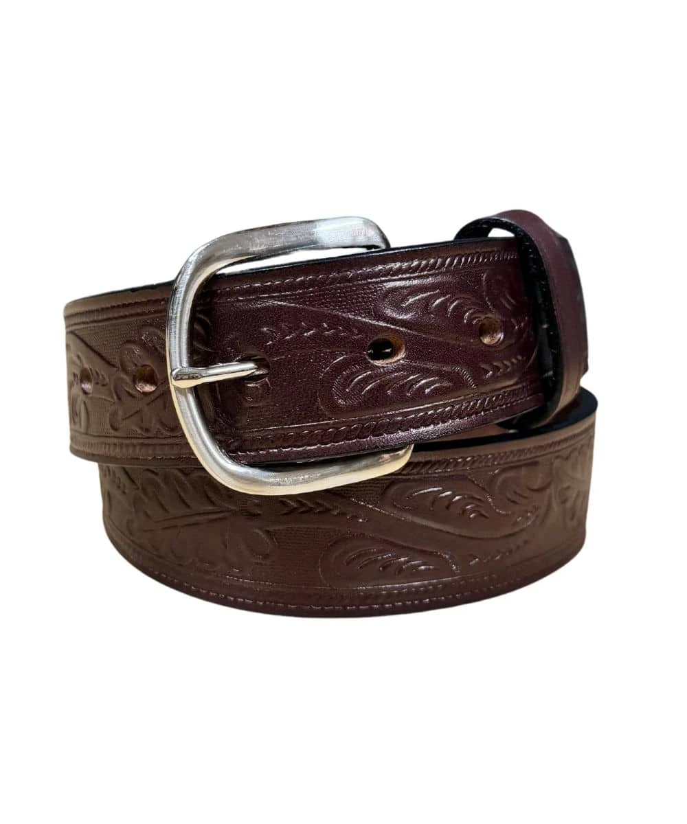 1.5″ Wide; Embossed Stitched And Leaf Design; Creased/Straight Leather Keeper; Matte Nickle Dress Buckle; Bulleted Tip; Classic Leaf Design; Color: Dark Brown; Style #8614-36