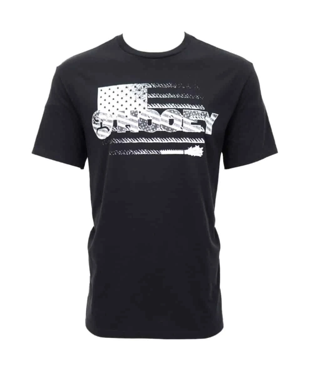 50% Cotton/50% Polyester; Short Sleeves; Crew Neck; Front Logo Screen Print With Rope Flag Graphic; Color: Black; Style #HT1748BK