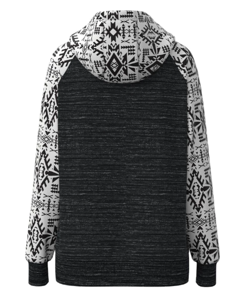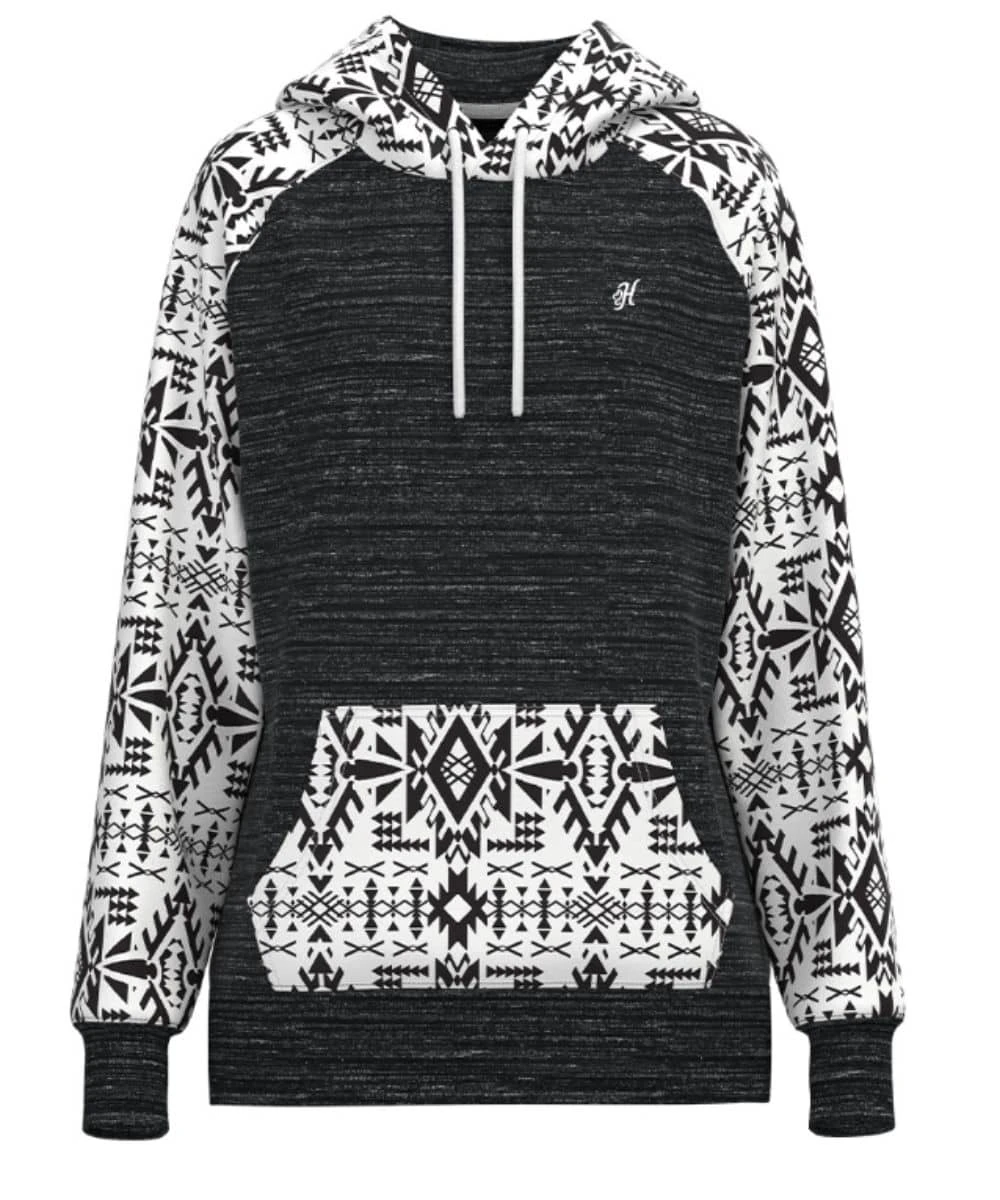 58% Cotton/38% Polyester/4% Elastane; Long Sleeves; Hooded Collar With Drawstring; Logo Embroidery On Chest; Kangaroo Pocket; Black/White Aztec Pattern On Sleeves, Hood, And Pocket; Black Space Dyed Body; Color: Black/White; Style #HH1358BKAZ