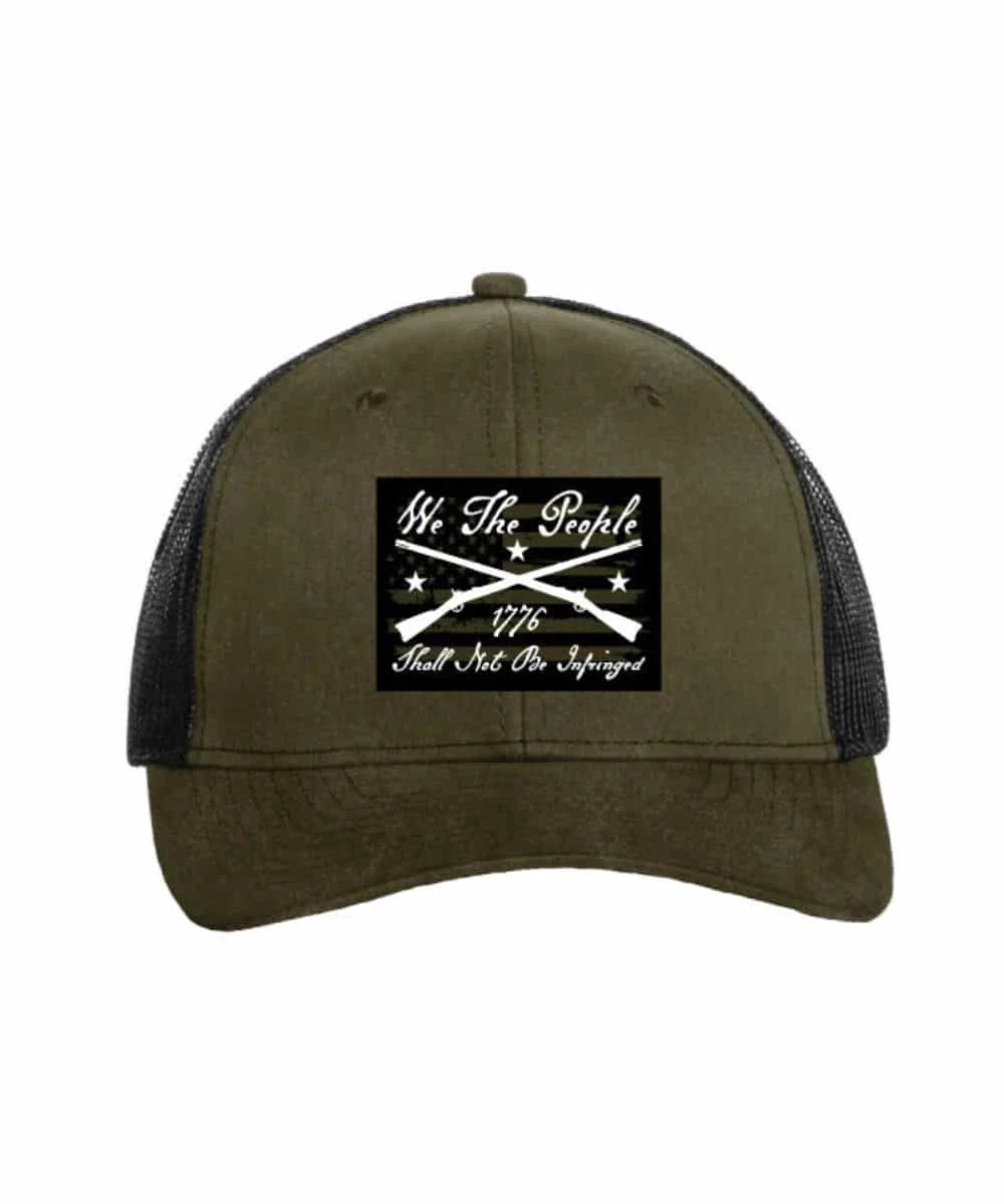 100% Polyester; 6 Panel Construction; Mid-Profile Fit; Olive Front And Bill; Patch On Front Reads: “We The People Shall Not Be Infringed” With American Flag Background; Curved Bill; Black Mesh Sides And Back; Classic Snapback Closure; One Size Fits Most; Color: Olive/Black; Style #CV7050
