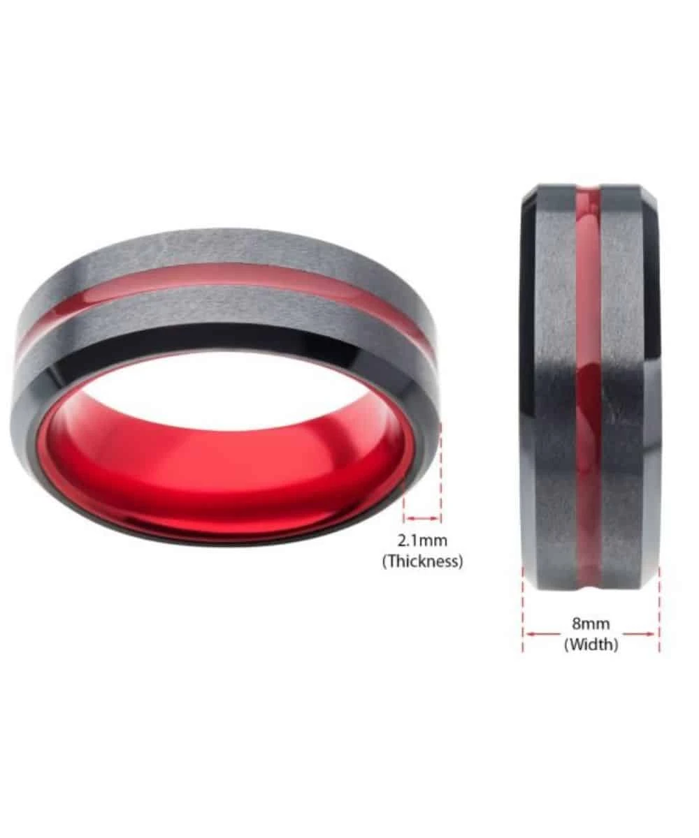 Black IP Steel Beveled Comfort Fit Ring; Red Aluminum Inlay; Contemporary Design; Red Line Can Symbolize Firefighters, Love, Etc.; Style #FR60010