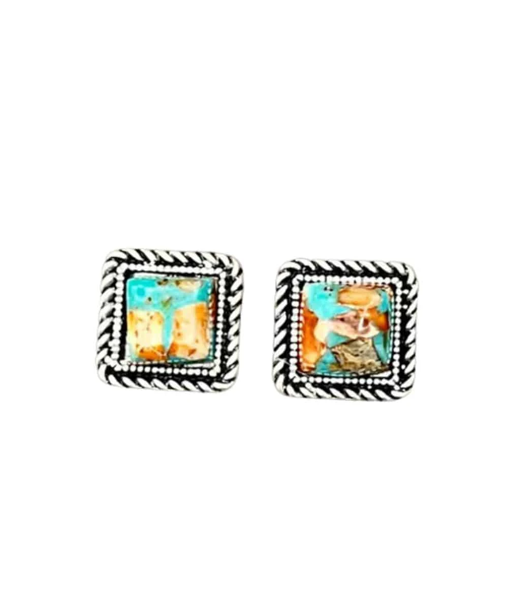 0.7″ Long, Gemstone Stud Earrings; 10 mm Square Gemstone; Alloy Metal, Antique Silver Plate; Natural Stone May Vary In Size, Color, Or Shape; Nickel, Lead, And Chrome Free; Color: Turquoise/Orange; Style #726345