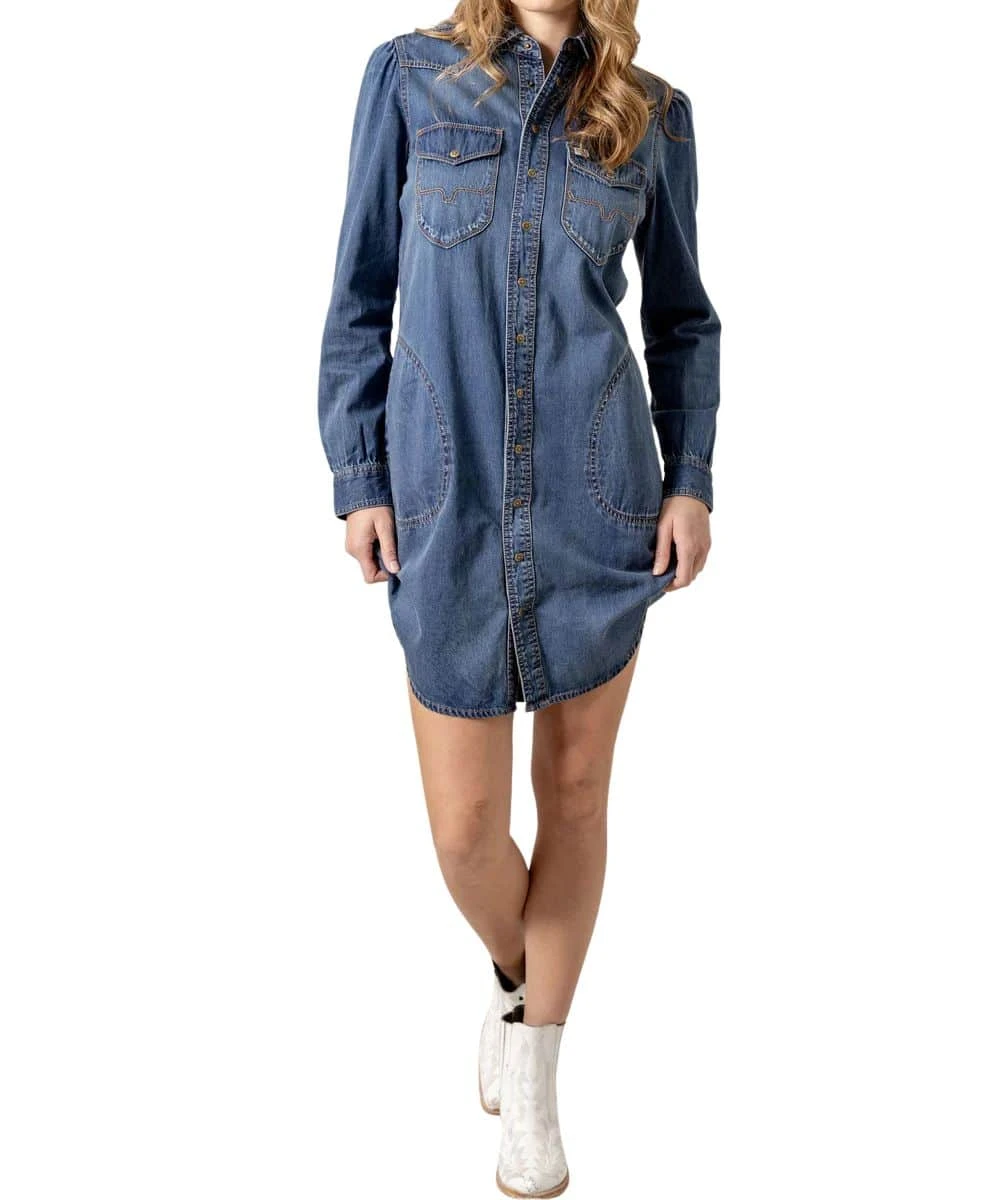 100% Cotton; Regular Fit Denim Dress; Long Sleeves; Spread Collar; Snap Front Closure And Cuffs; Star Snaps; Single Point Snap Flap Chest Pockets With Longhorn Logo Stitching; Open Hand Pockets; Single Point Western Yokes; Above The Knee Length; Color: Indigo Blue; Style #ROX DRESS