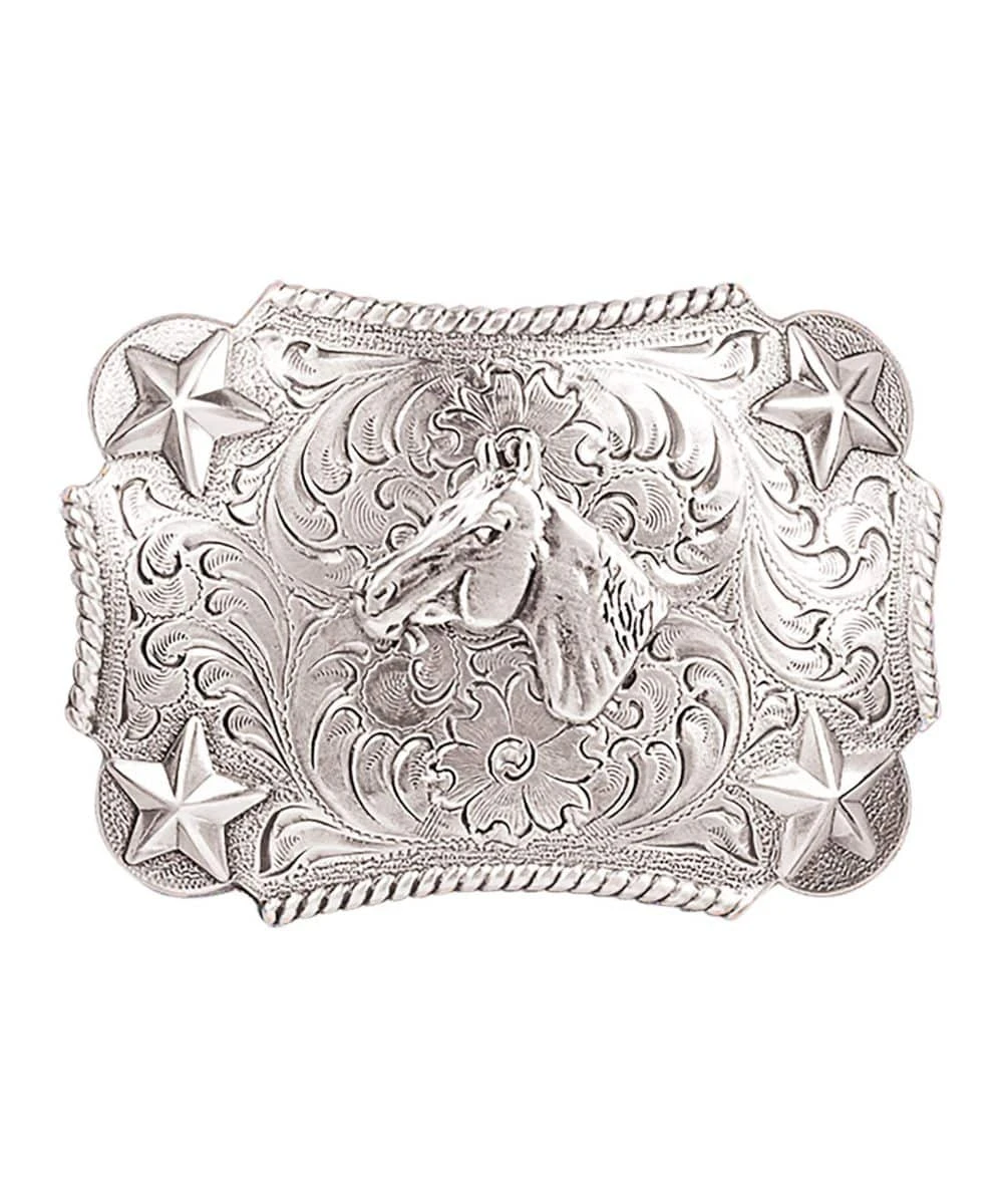 Silver; Rectangle Belt Buckle; Rope Edge; Horsehead Motif In Center; Star Corners; Filigree Background; Measures Approximately: 2″ x 3″; Style #3603007