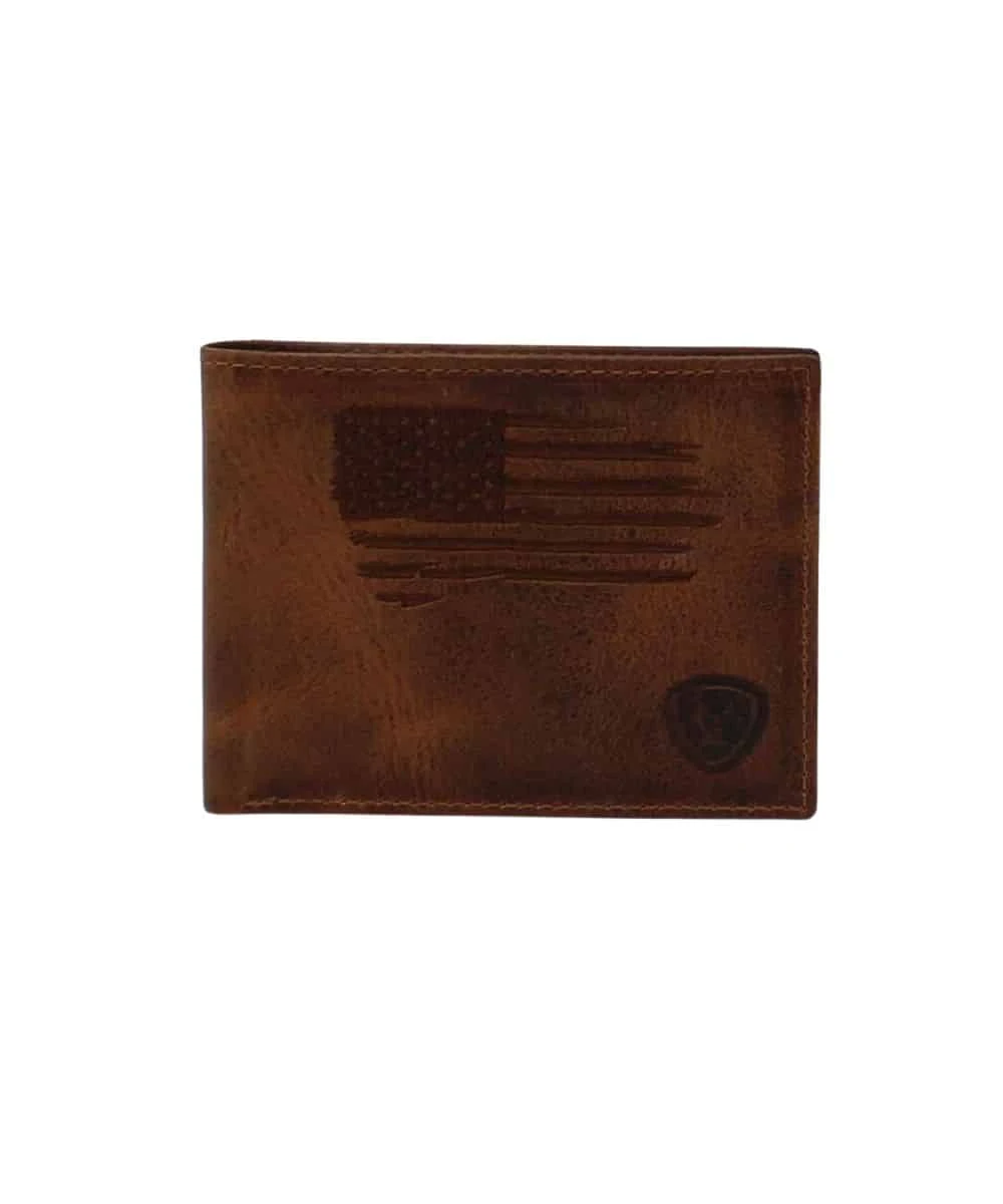 Brown Leather; Distressed USA Flag Stitched On Front; Ariat Shield Logo Stamped In Bottom Corner; Multiple Card Slots, Cash Compartment, Removable Photo Slip, Clear ID Slot; Bifold Wallet; Style #A3545602