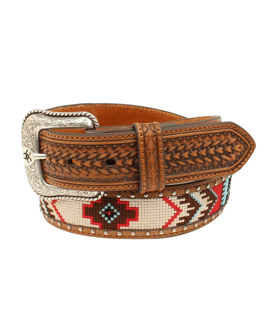 Embossed Leather; Multi-Colored Western Fabric; 1-1/2″ Wide Strap; Dome Nail Heads Along Edge; Embossed Tabs Accented With Round Concho; Etched Buckle With Ariat Logo; Style #A1033297