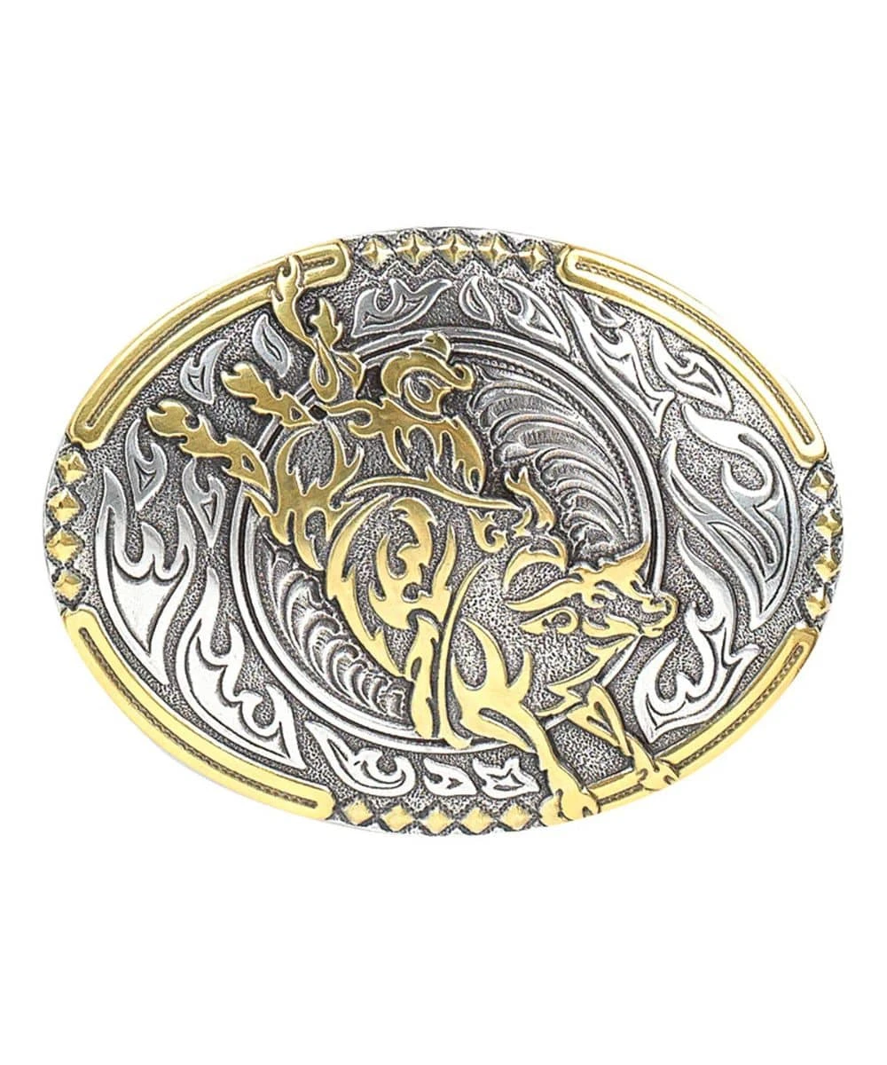Silver Oval Shaped Belt Buckle; Gold Dotted Edge; Gold Bull Rider Made Of Flames In Center; Measures Approximately: 2 3/4″ x 3 3/4″; Color: Silver; Style #38010