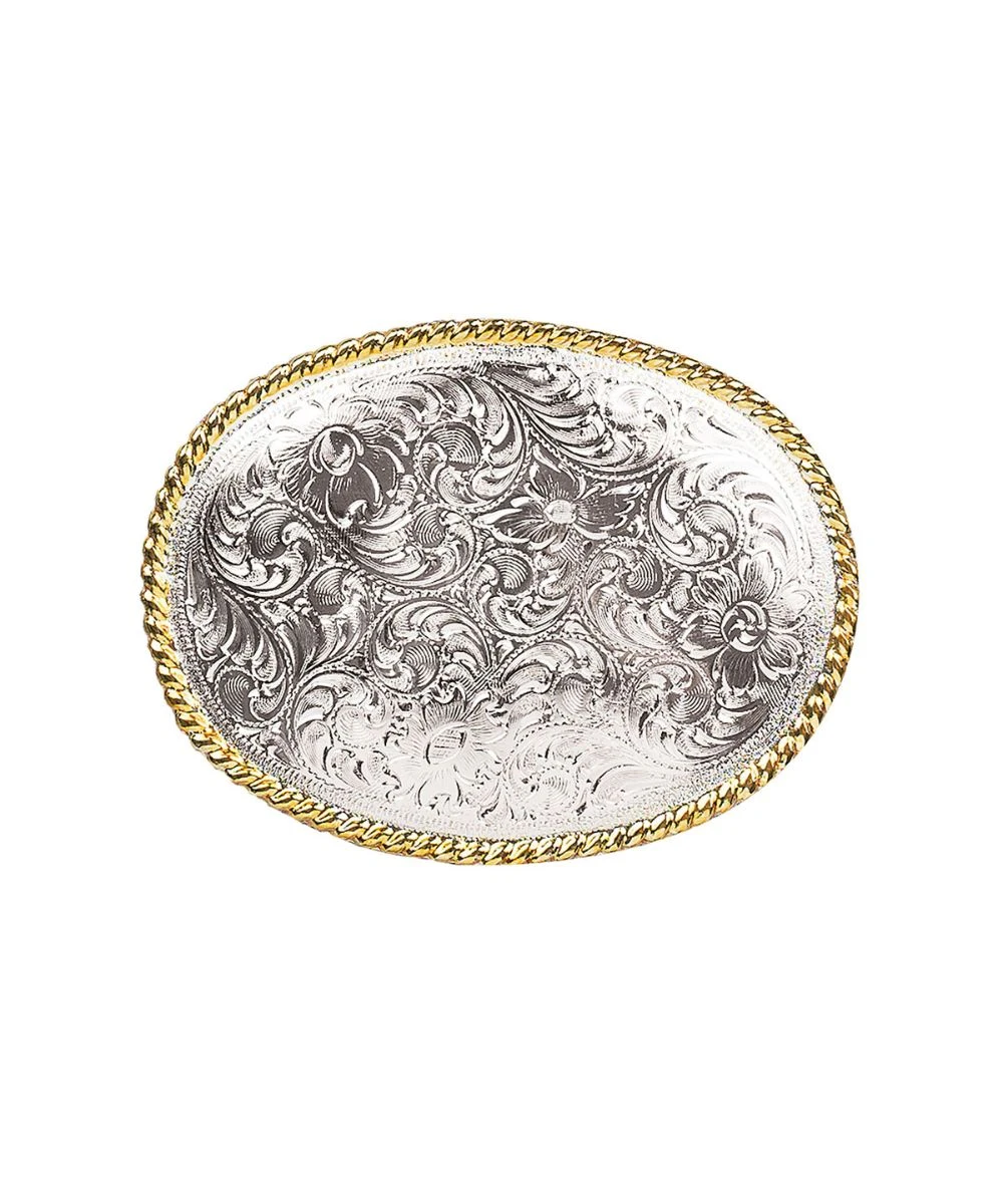 Silver Floral Scroll Buckle; Gold Rope Edge; Oval Shape; Measures Approximately: 2 3/4″ x 3 1/2″; Style #37220