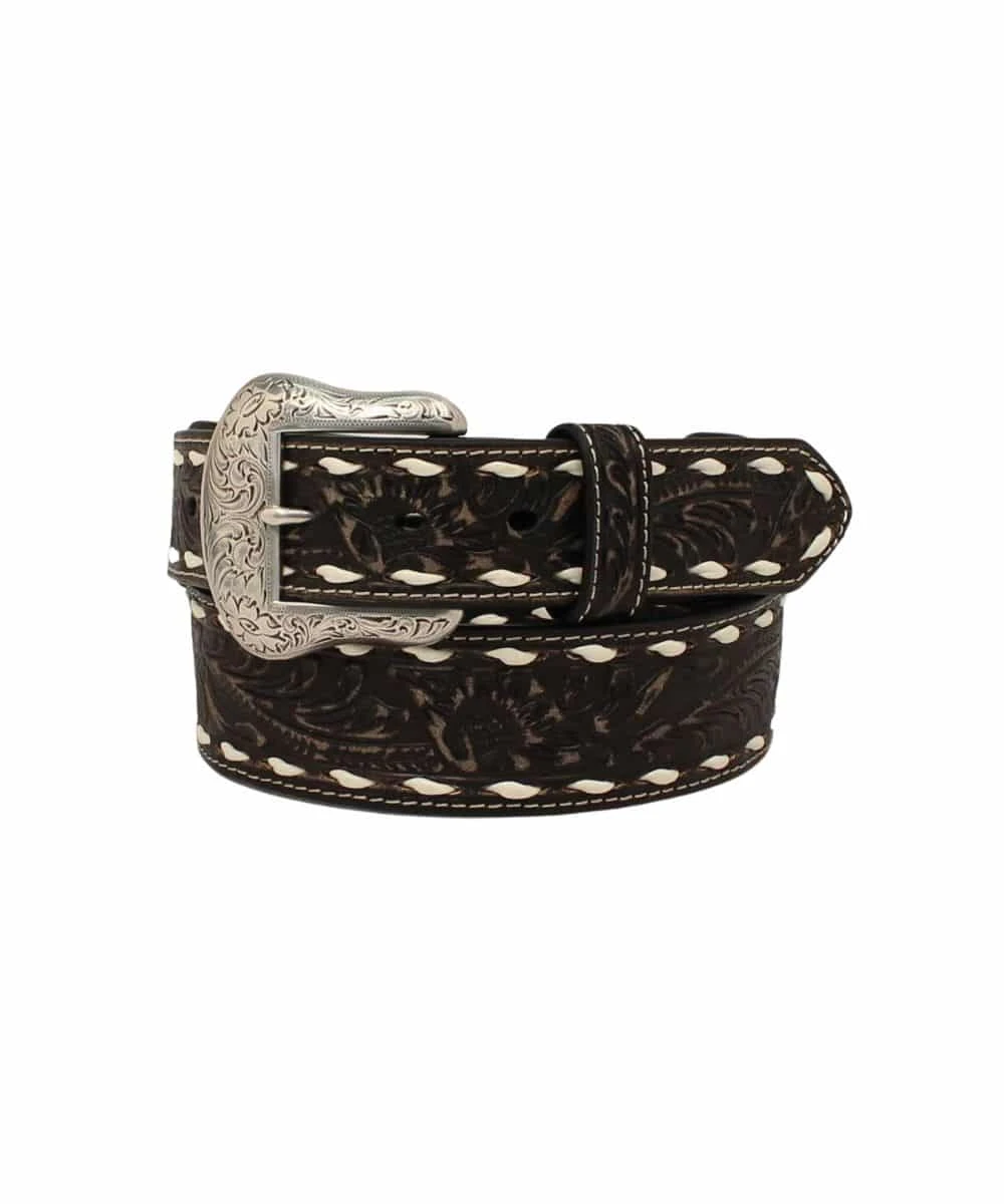 Genuine Leather; Floral Embossed Pattern; Color: Distressed Black; White Lacing; 1-1/2″ Wide Strap; Etched Silver Buckle; Single Leather Keeper; Style #N210005101