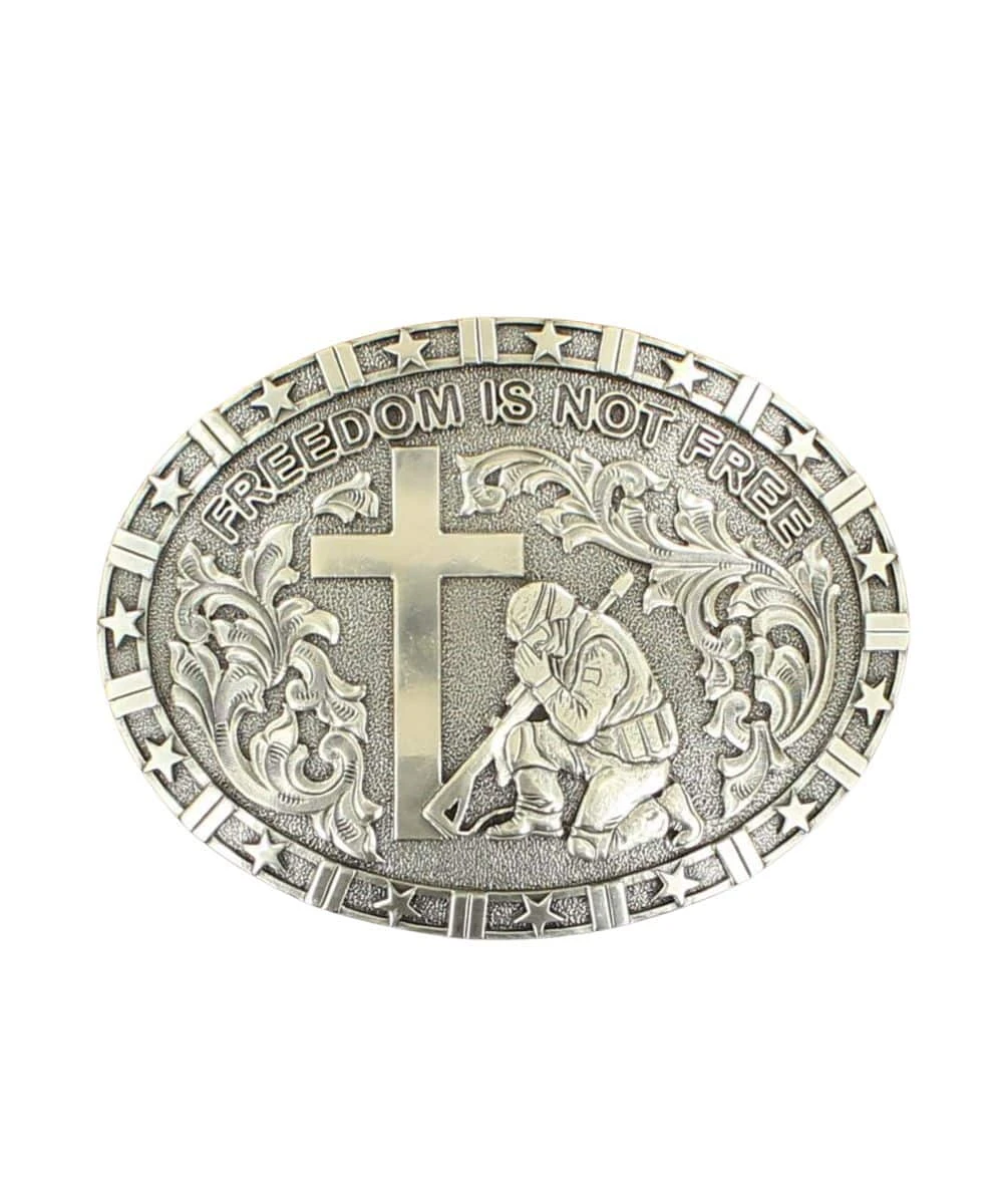 Silver; Oval Belt Buckle; Kneeling Soldier At Cross In Center; Buckle Reads: “Freedom Is Not Free”; Star Pattern Border; Smooth Edge; Measures Approximately: 2 3/4″ x 3 3/4″; Style #37985