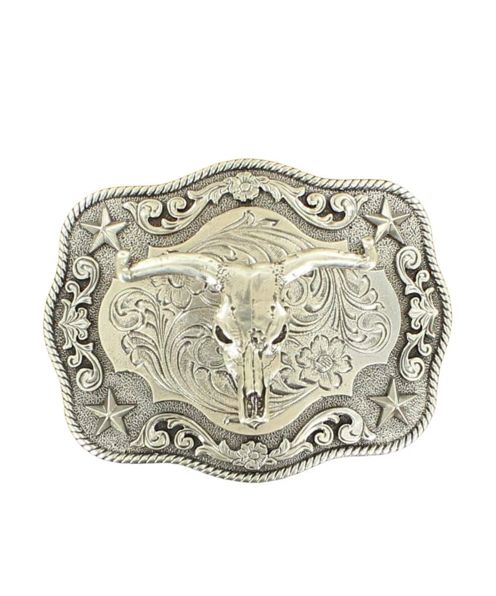 Silver; Rectangle Belt Buckle; Steer Skull Center With Scroll Background; Star Corners With Rope Edge; Measures Approximately: 3 1/8″ L x 4″ W; Style #3798664