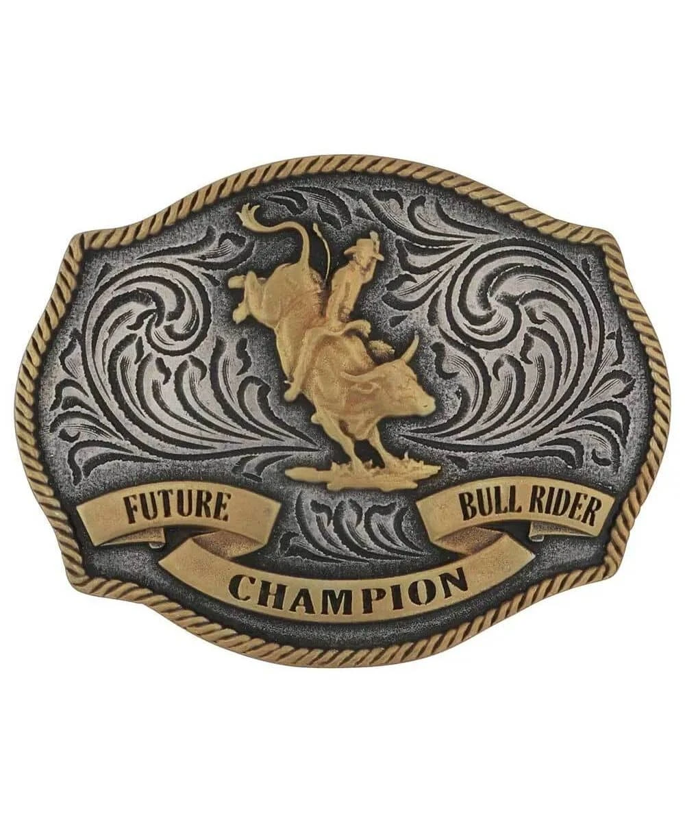 Silver And Gold Over Zinc Alloy; Featuring A Gold Tone Bull Rider Figure In The Center; Silver Tone Engraved Background; “Future Bull Rider Champion” On A Gold Banner At The Bottom; Gold Tone Roped Border; Protective Coating; 1.5″ Back Swivel; Measures Approximately: 3″ W x 2.25″ H x 1″ L; Style #A1025P