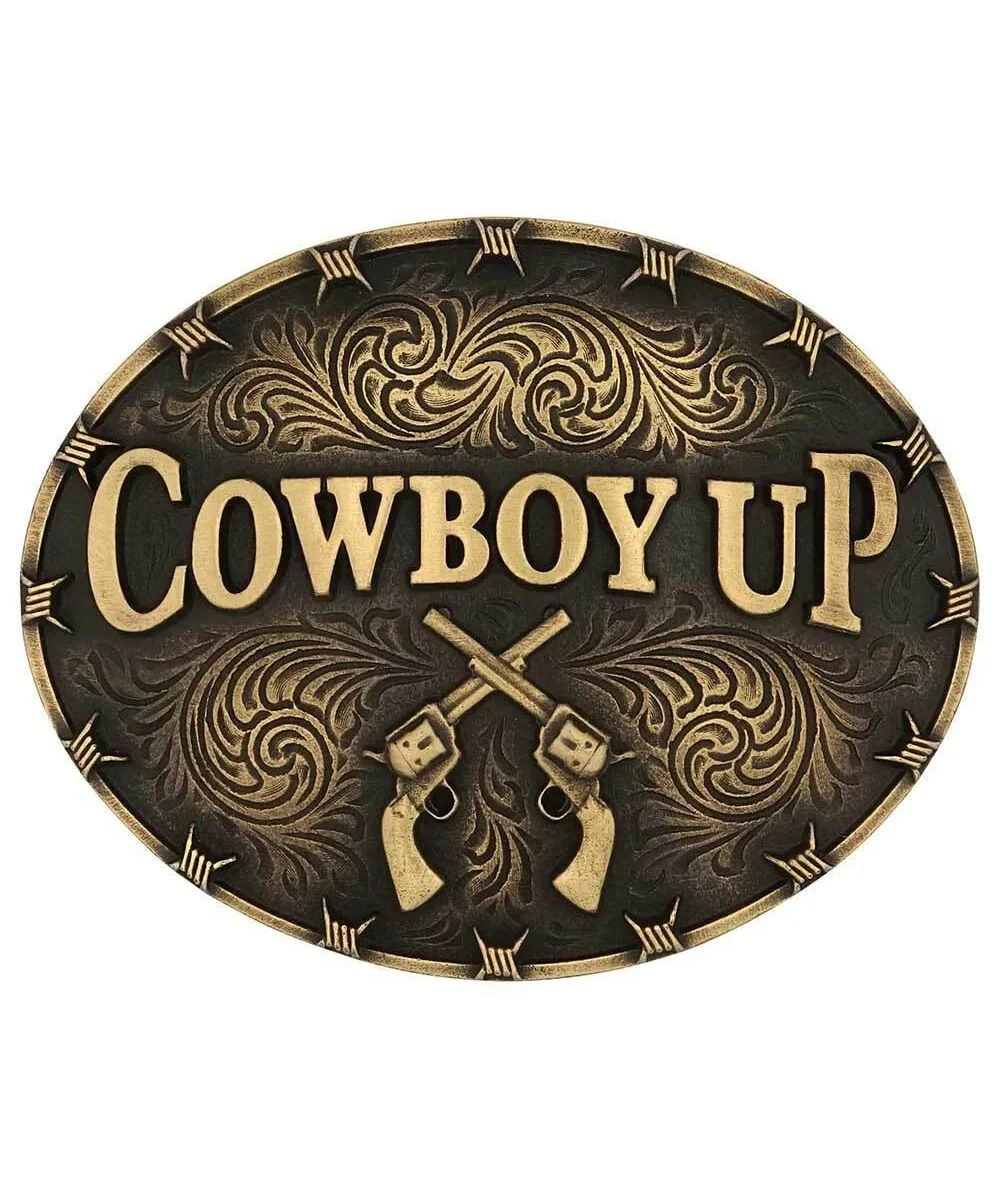 Brass Over White Metal Alloy Base; Oval Belt Buckle; Features The Words: “Cowboy Up” With Two Crossed Revolvers Underneath; Antiqued Filigree Scrolls Provide Contrast To The Brighter Gold Tone Of The Buckle; Unique Barbed Wire Designs Adorn The Edge Of The Buckle; Standard 1.5″ Swivel; Protective Coating; Measures Approximately: 4.21″ W x 3.31″ H x 1″ L; Style #A1007C