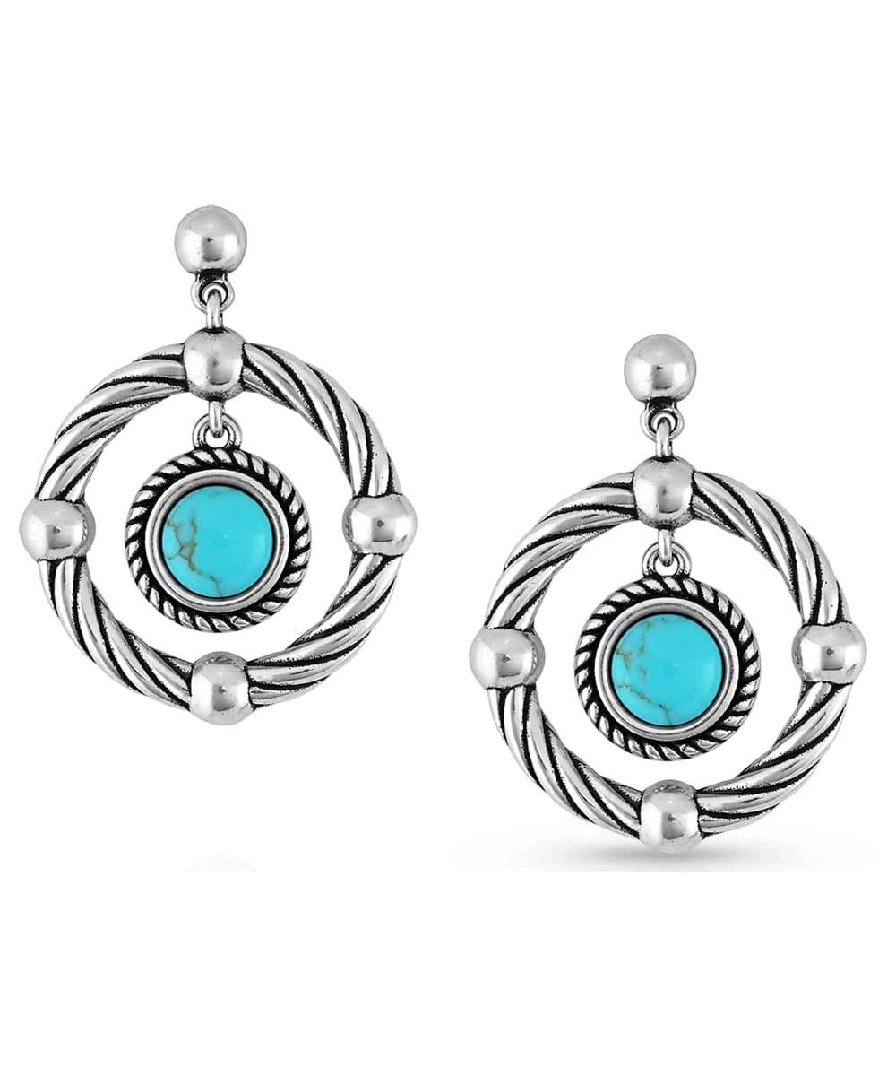 Circular Twisted Rope With Four Balls; Round Turquoise Stone Swings In Center Of The Earrings; Twisted Rope Surrounds Turquoise Stone; Secured By An Effortless Post-Back Wire; Silver Over A Brass Base; Synthetic Turquoise; Hypoallergenic Stainless Steel; French Hooks; Style #ER5304