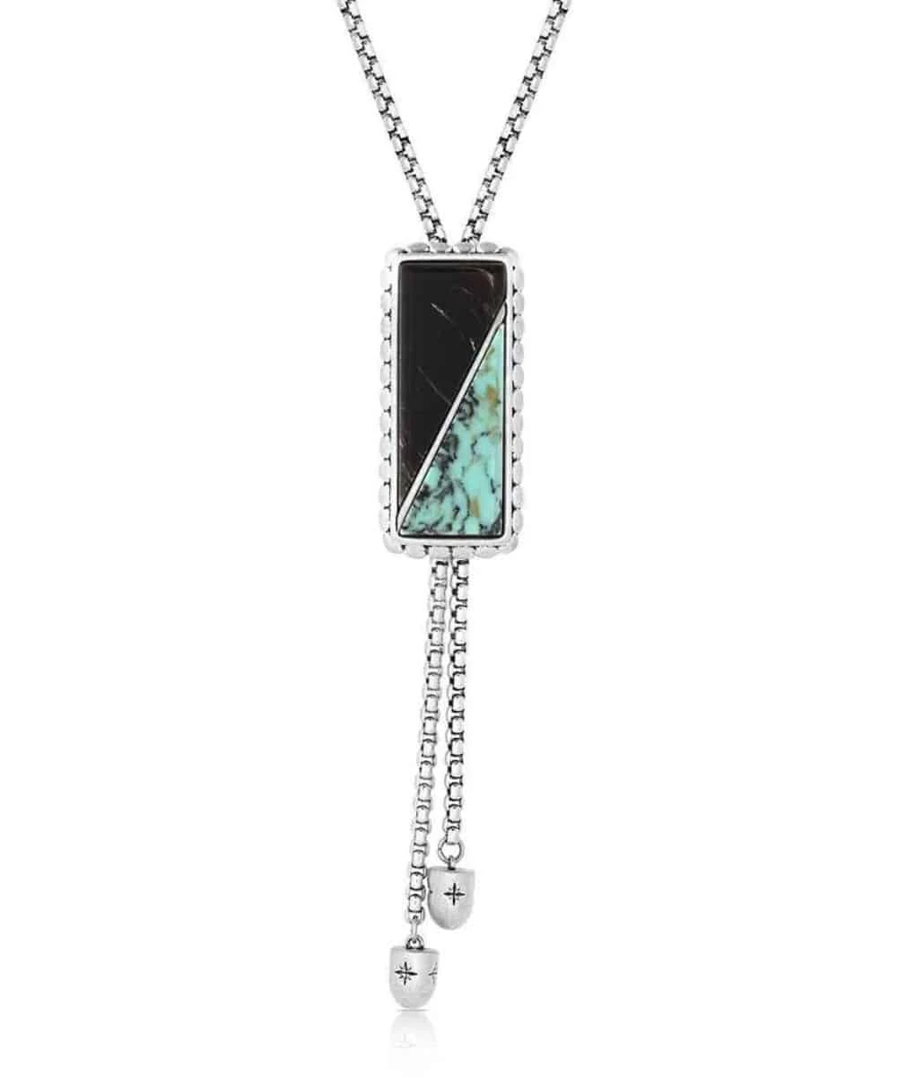 Silver Over Brass Base; 32″ Box Chain; Rectangular Shaped Pendant Is Made Of Half Crafted Onyx And Half Crafted Turquoise Stones With Silver Tone Border; Two Box Chains Hang From The Pendant With Star Accented Tips; Design Resembles A Bolo Tie; Protective Coating; Measures Approximately: 0.7″ W x 1.6″ H x 32″ L; Style #NC6011