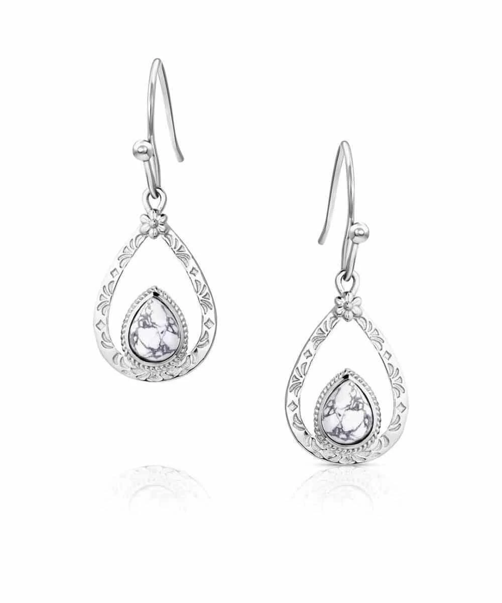 Rhodium Over Brass Base; Open Teardrop Shape With Natural White Howlite White Buffalo Stones At The Bottom Surrounded By Silver Tone Roped Border; Hypoallergenic Stainless Steel French Wires; Measures Approximately: 0.6″ W x 1″ H x 0.3″ L; Style #ER6017